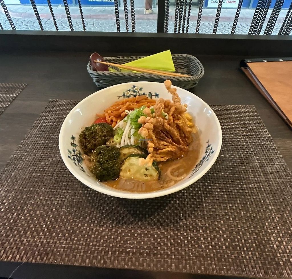 The place is centrally located with unfortunately very tight spaces between tables. They have vegan ramen soups and appetizers. We tried 2 different versions. One was well seasoned, the other was a bit bland. But the biggest drawback was the limited amount of added toppings. No tofu or other protein. Only some corn, a bit of leafy greens and algae. It was a bit disappointing for the price we paid. But definitely an option if you want a ramen soup.