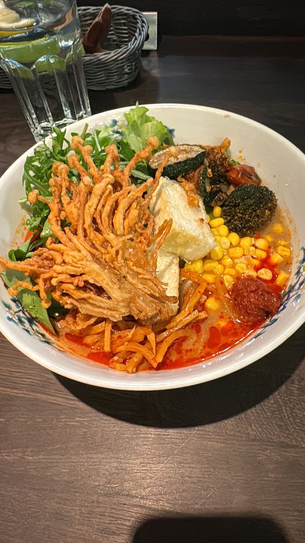 Vegan dandan ramen (spicy sesame sauce) with crunchy tempura veggies o…