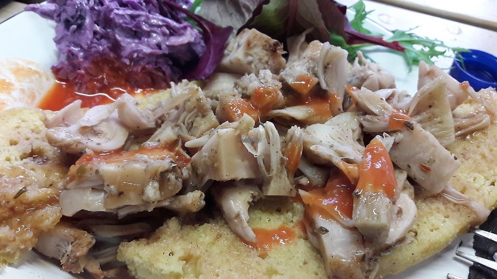 Jerk jackfruit on dumpling with chilli sauce & vegan gravy