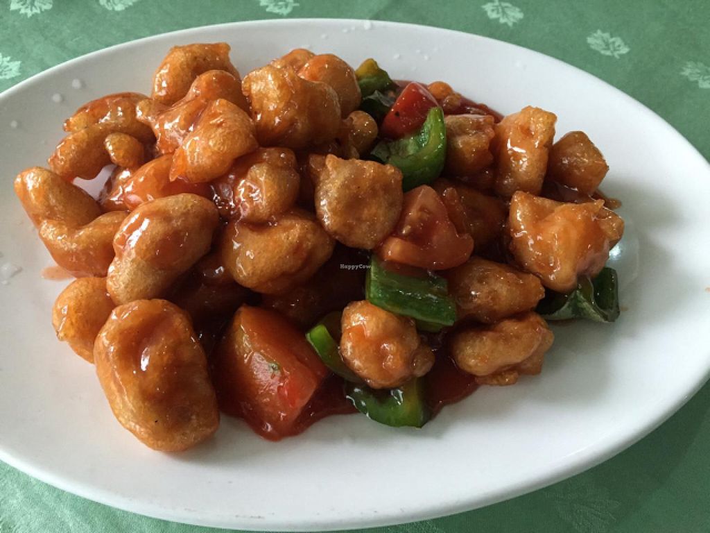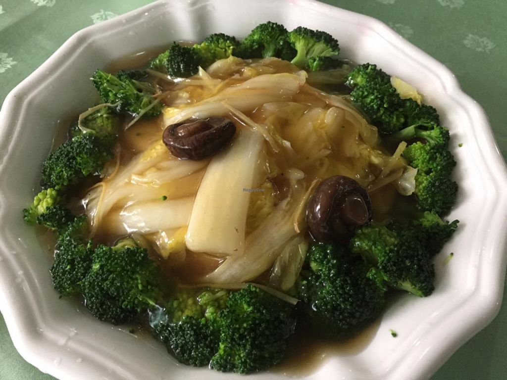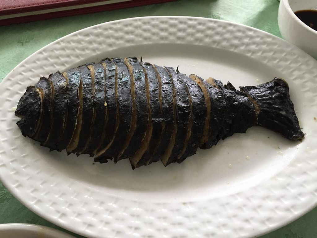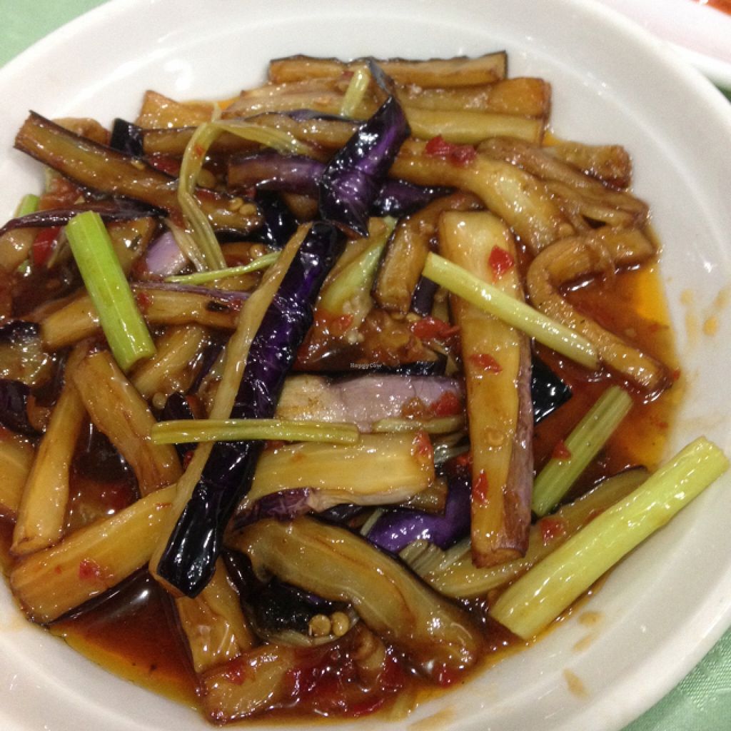 No English outside, so look for the big Chinese name above, outside. Kind of bright inside at night, but friendly staff, and quite tasty food, especially for the price. Nice photos to point at in the extensive menu for showing what food you want. Plenty of veggie fishes, plus good fake-meat dishes. All vegan!