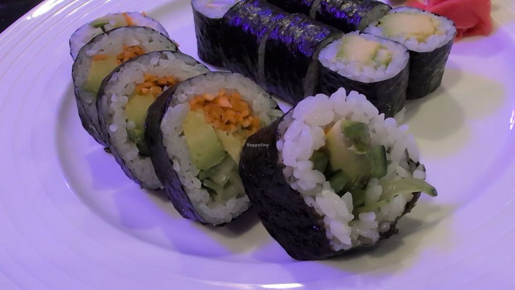 Serves meat, vegan options available. Restaurant offering vegan and veganizable dishes like avocado roll (rice roll with avocado), vegetable roll (fried vegetable sushi roll), and cucumber roll (rice roll with cucumber). Open Mon 11:00am-9:30pm, Wed-Sun 11:00am-9:30pm. Closed Tues.