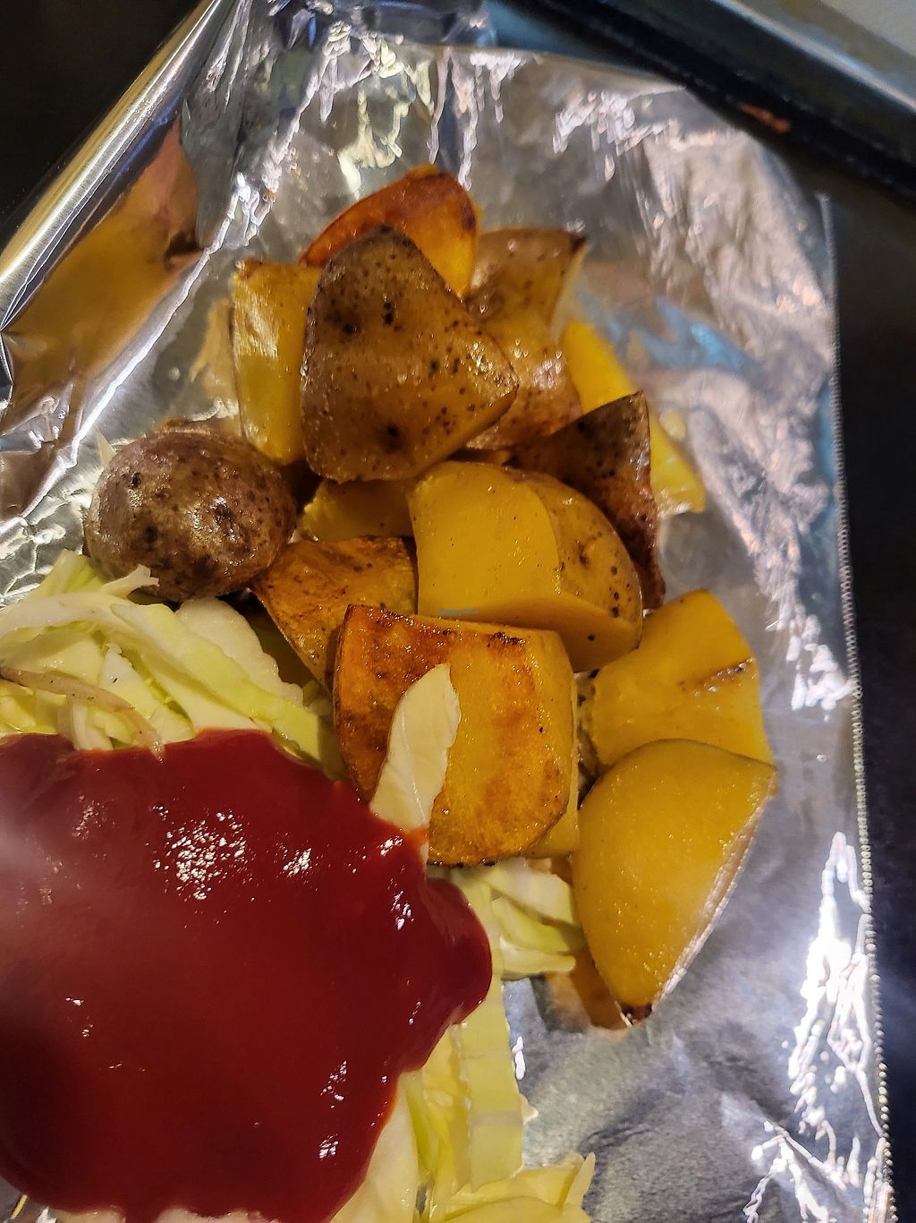 Mix of vegan okonomiyaki, jirokichi roll and garlicky potatoes with ve…