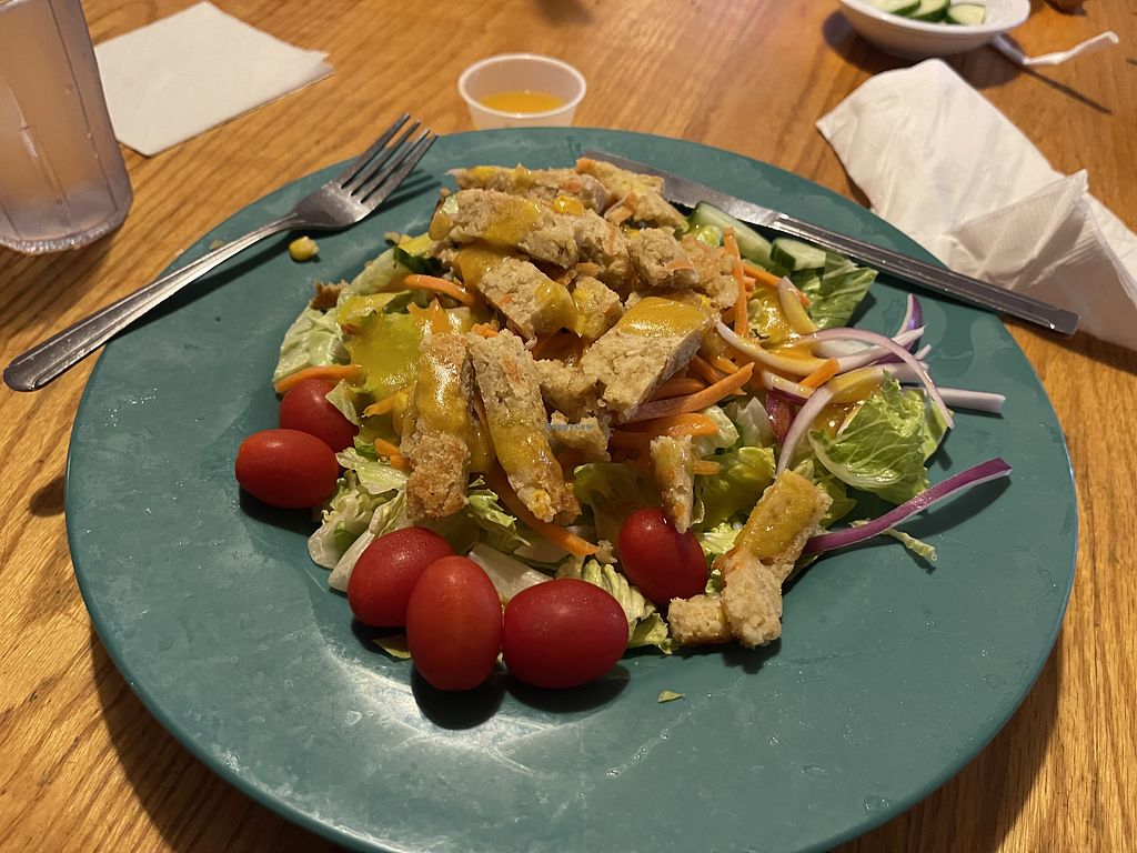 Didn’t see Beyond Burger on the menu, though I didn’t ask since I’d already had two in the past 24 hours of camping! It took work to find an option as the entrees that featured the Veggie Cake had non-vegan elements. Worked through server to figure out I could do a salad with the Veggie Cake as a topper.