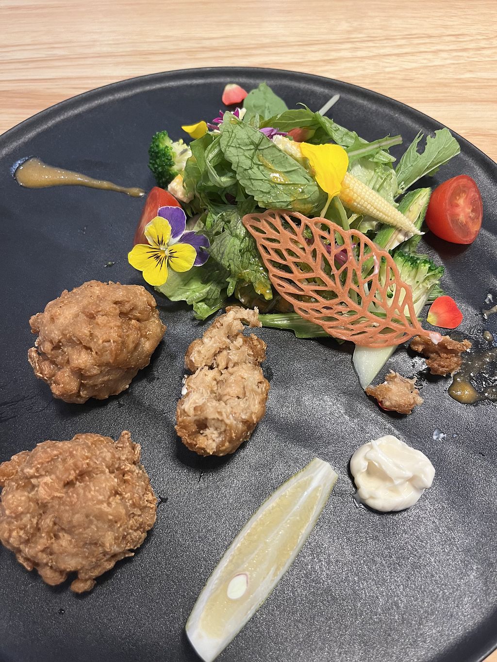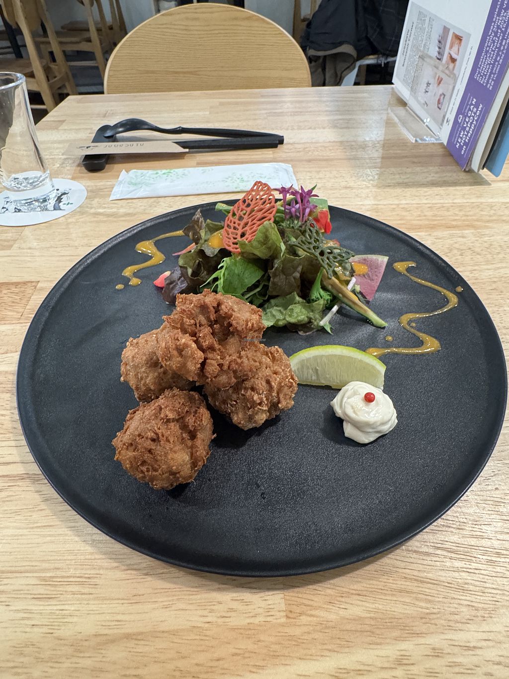 Next I got Karaage. I’ve seen the meat version before and always wanted to try a vegan version. So when I saw that, I told myself I’m getting it, no matter what. Had that and it was so good. Crunchy on the outside and juicy inside with a vegan mayonnaise I think you can dip in and it adds a whole other flavor profile. I think it’s mayonnaise, I could be wrong. Please correct me if I’m wrong.