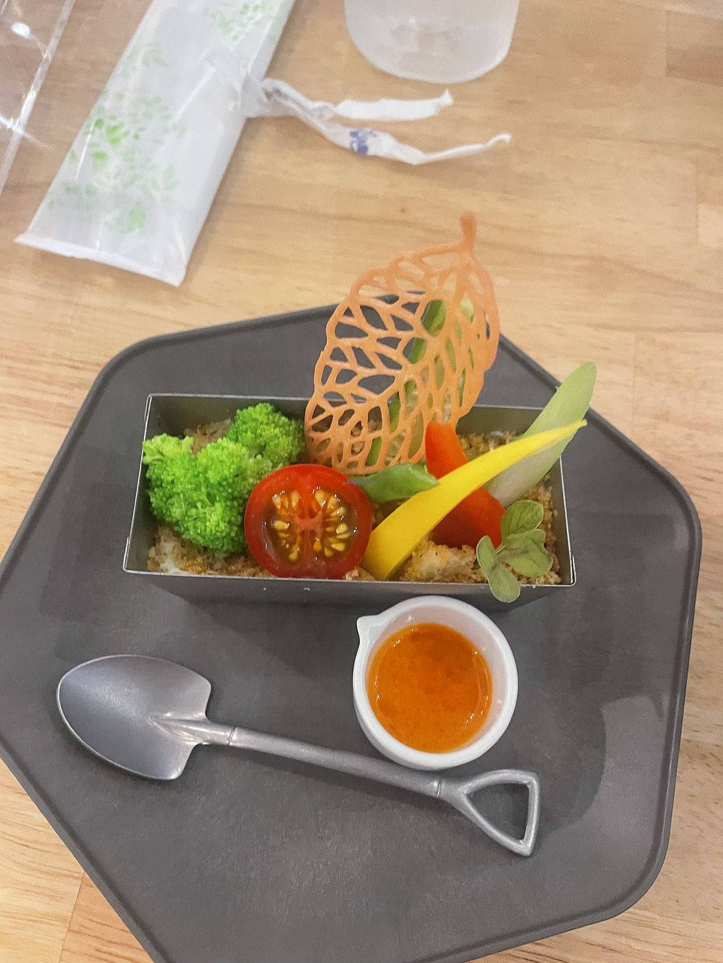 Read moreThe potato salad was presented as a miniature garden scene with vegetables 'growing' in the potato soil, a tiny bucket of carrot-based sauce, and an equally tiny spade included to scoop it up with. I would not have been surprised to see Peter Rabbit pop up!