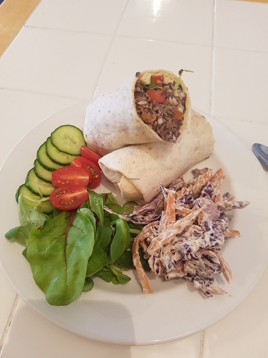 Black bean and avacado wrap with side salad and slaw. Delicious!