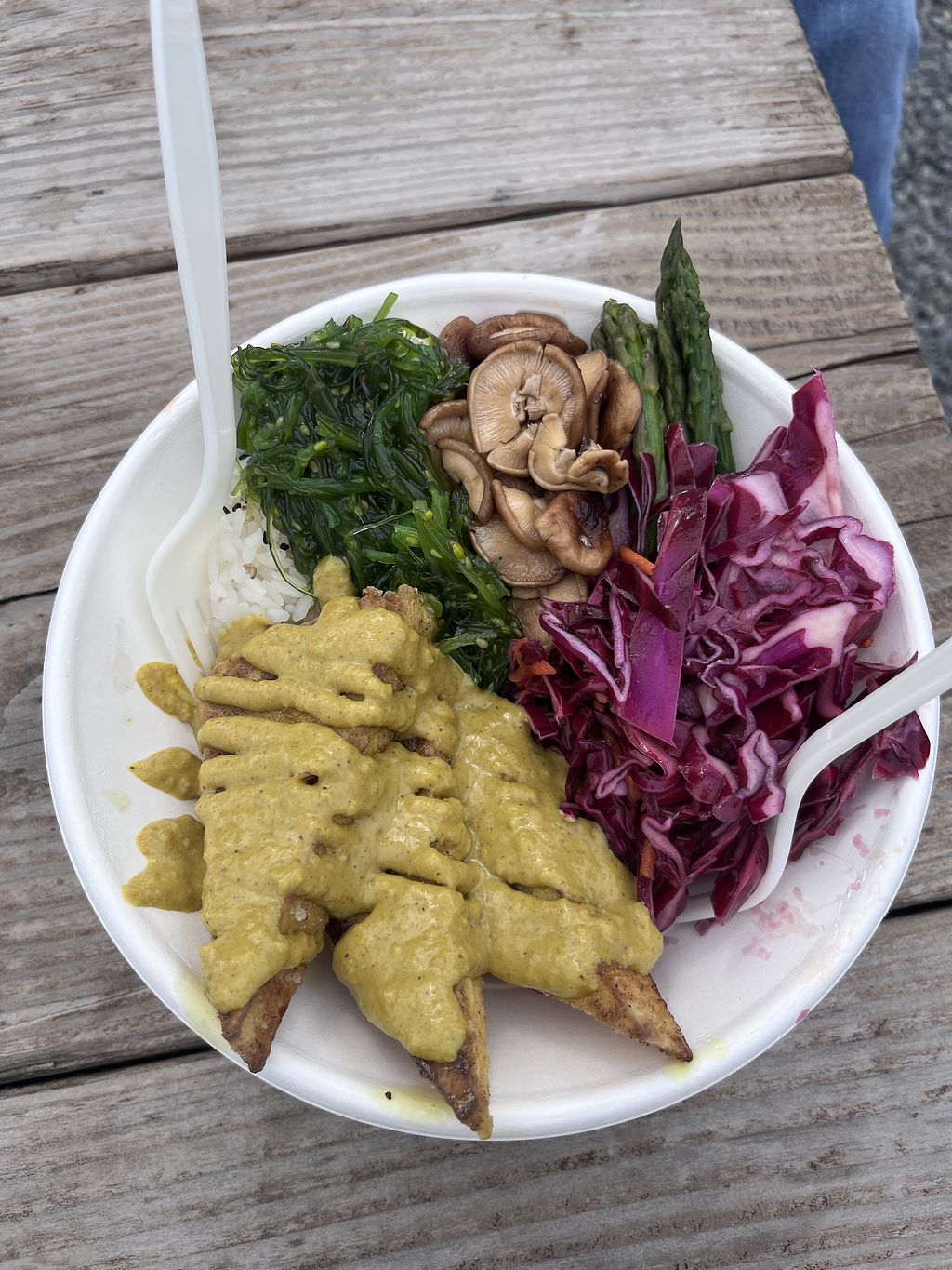 Like everyone else - had the crispy tofu, topped with peanut sauce, rice. Seaweed, picked onion mushrooms and red cabbage. Was a great fresh meal (mention you are vegan)