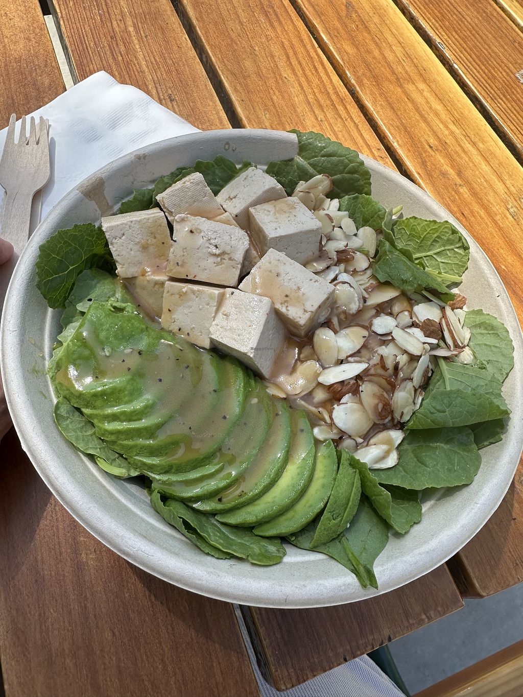 The cafe and store is located inside a popular shopping plaza. You order the food from the counter and sit outside in the courtyard to eat. It's basically fast food: burgers and sandwiches. We usually get the veggieburger or veggie sandwiches. Vegan options are limited, but the staff will accommodate upon request.