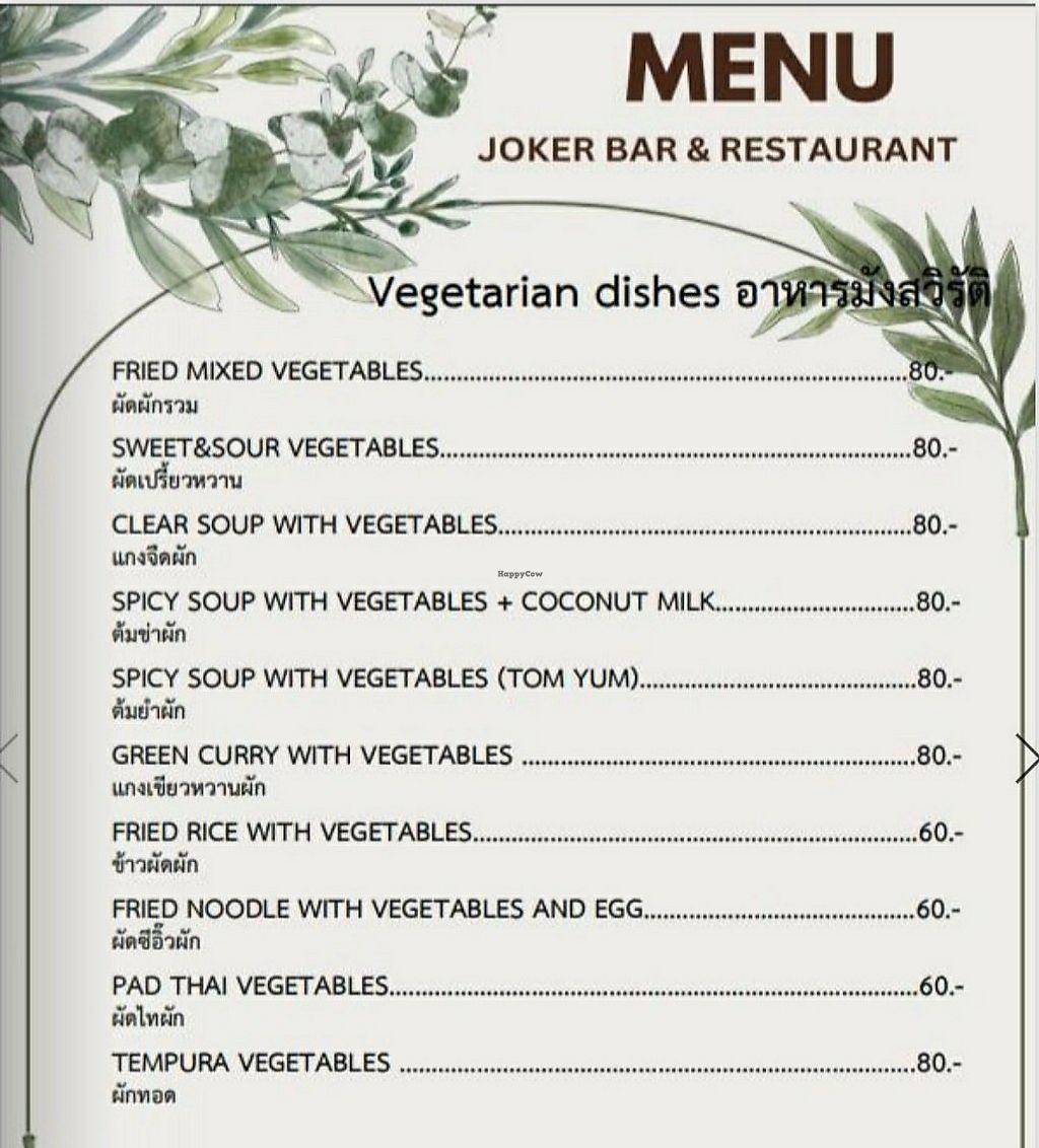 Serves meat, vegan options available. Restaurant with a page of vegetarian options, many of which can be made vegan, such as sweet and sour vegetables and tom yum. Thai tea is available with coconut milk upon request. Open Mon-Sun 8:30am-10:00pm, Fri-Sun 8:30am-10:00pm. Hours may vary seasonally. Open during the off season - check ahead.
