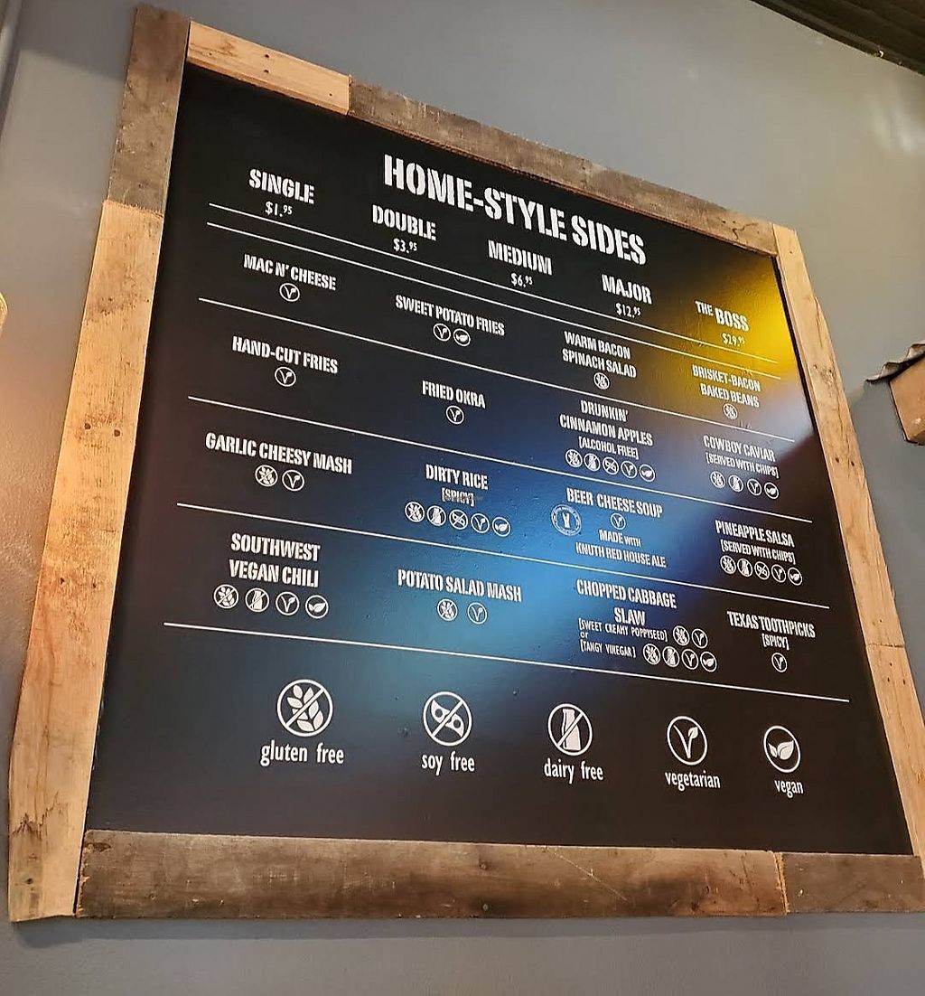 Serves meat, vegan options available. BBQ restaurant with labeled vegan dishes including potato pancakes, sweet potato fries, drunken cinnamon apples, cowboy caviar, dirty rice, southwest vegan chili and tangy vinegar slaw. Reported closed, May 2023.