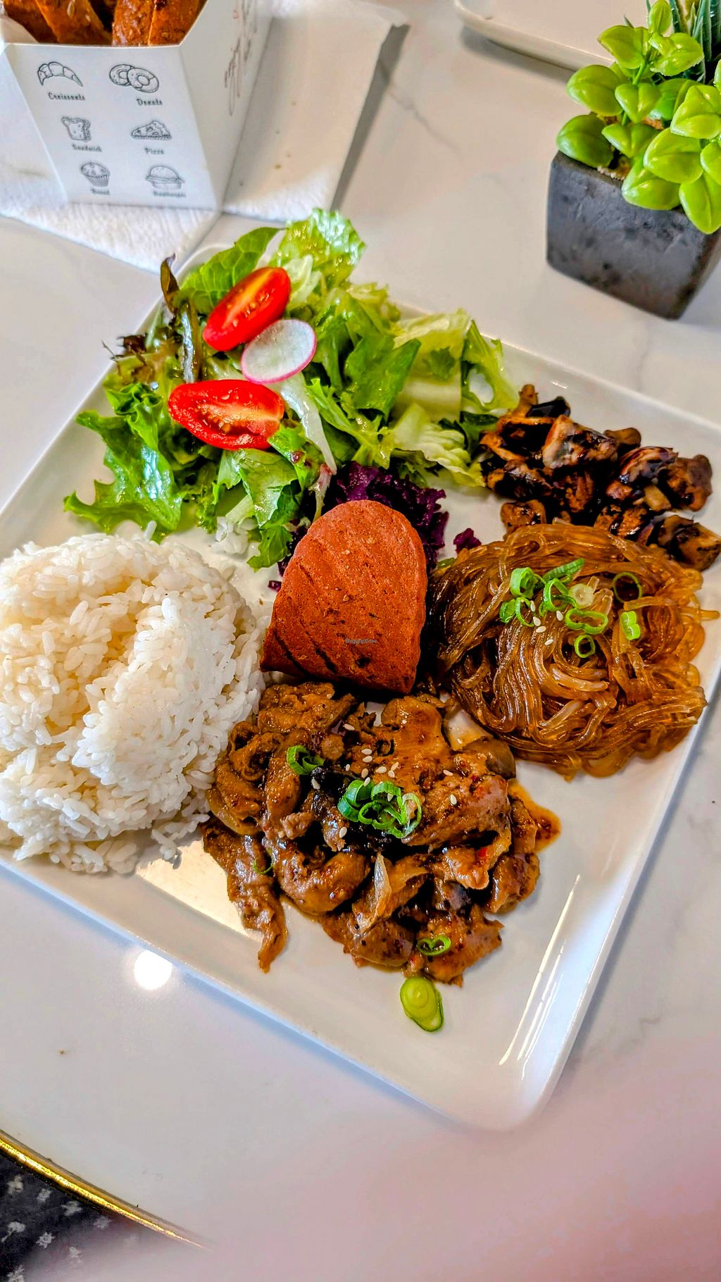 Serves meat, vegan options available. Korean cafe and restaurant with vegan choices. Menu is clearly labeled and includes vegan egg drop sandwich, BLT egg panini and vegan bento box. Additional vegetarian dishes may be able to be made vegan upon request. Open Mon-Sat 9:00am-10:00pm. Closed Sun.