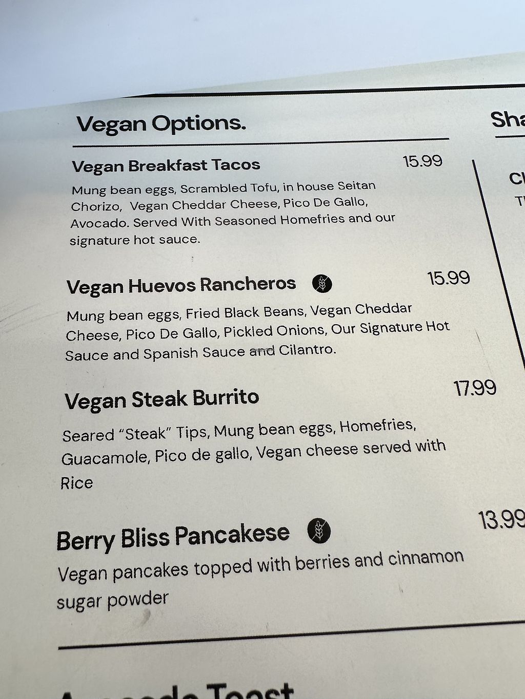 Vegan breakfast can be hard to find but I love it here! Very flavorful and filling. When I went this time around their vegan menu was very small though only 3 items.