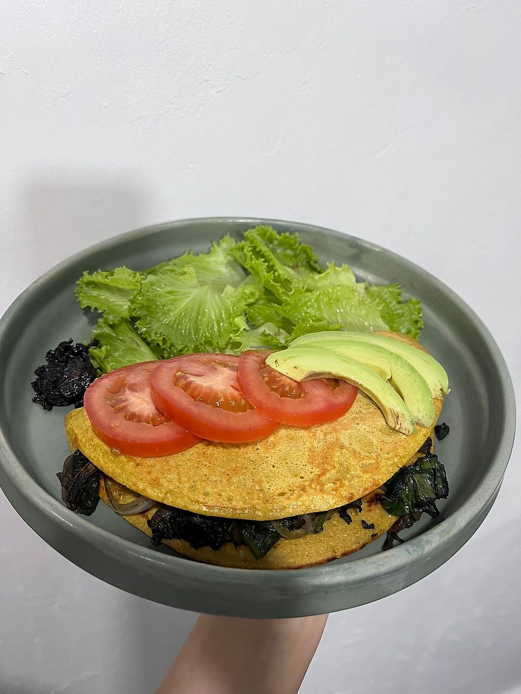 Omelette de harina de garbanzo 🫶 con champiñones y espinacas.