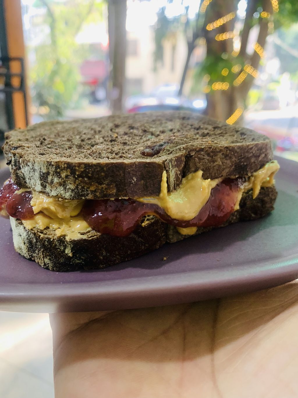 Sándwich de masa madre con crema de cacahuate 🥜 y mermelada de fresa 🍓…