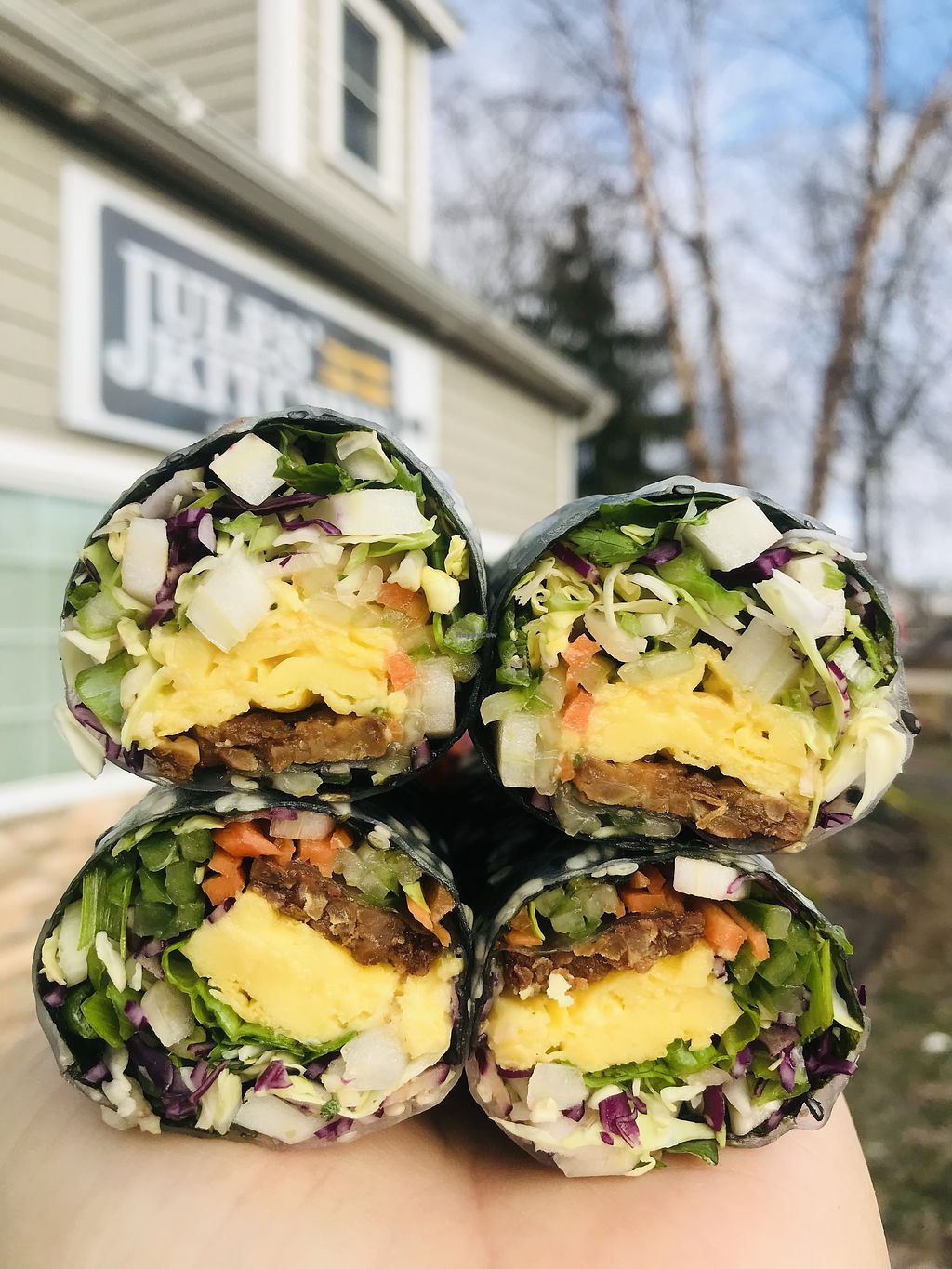 Serves meat, vegan options available. Restaurant open since March '22 offering vegan dishes/items daily. Includes a house-made veggie burger, fried oyster mushroom sandwich, vegetable rice paper rolls with dips, soups, hummus with naan bread, savory strudel with gravy, salads, rice bowl with tofu and other specials. Reported closed September 2024.