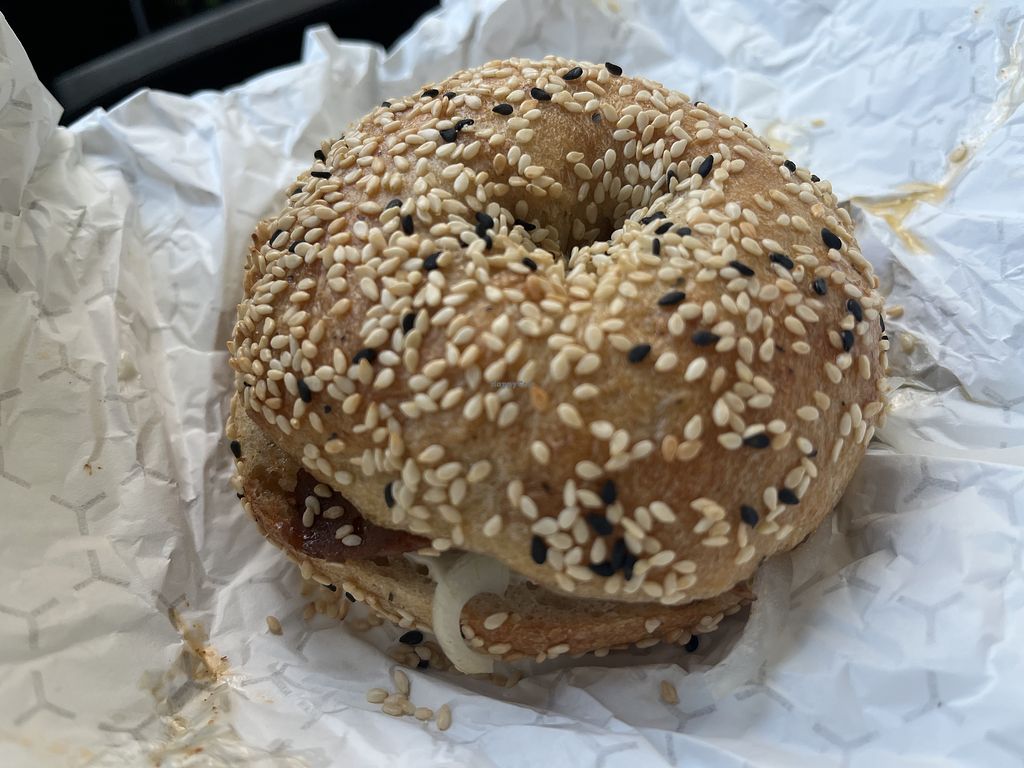 Serves meat, vegan options available. Bagel shop that offers various bagels with vegan versions of each of its spreads and proteins such as vegan cream cheese, vegan cheddar, vegan sausage, and vegan bacon. Serves coffee with an oat milk option. Also provides catering via bulk order. Open Tue-Fri 8:00am-2:00pm, Sat-Sun 9:00am-2:00pm. Closed Mon.