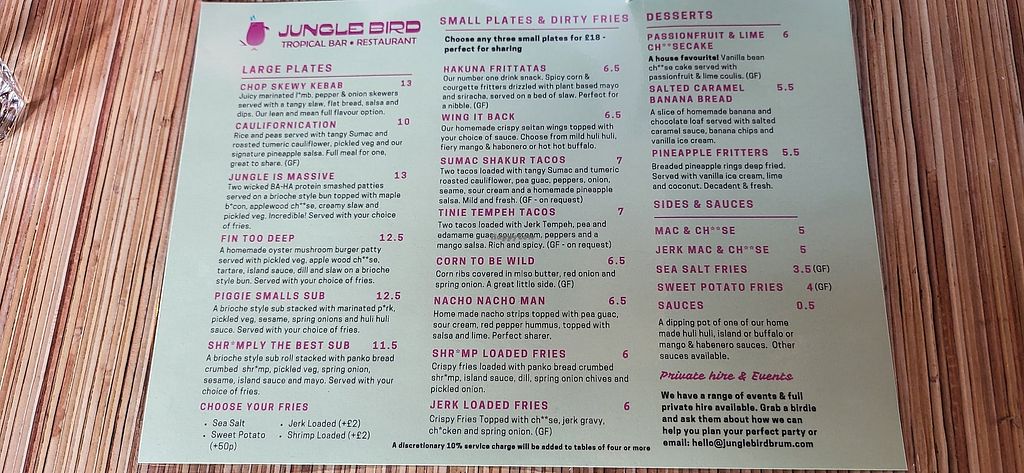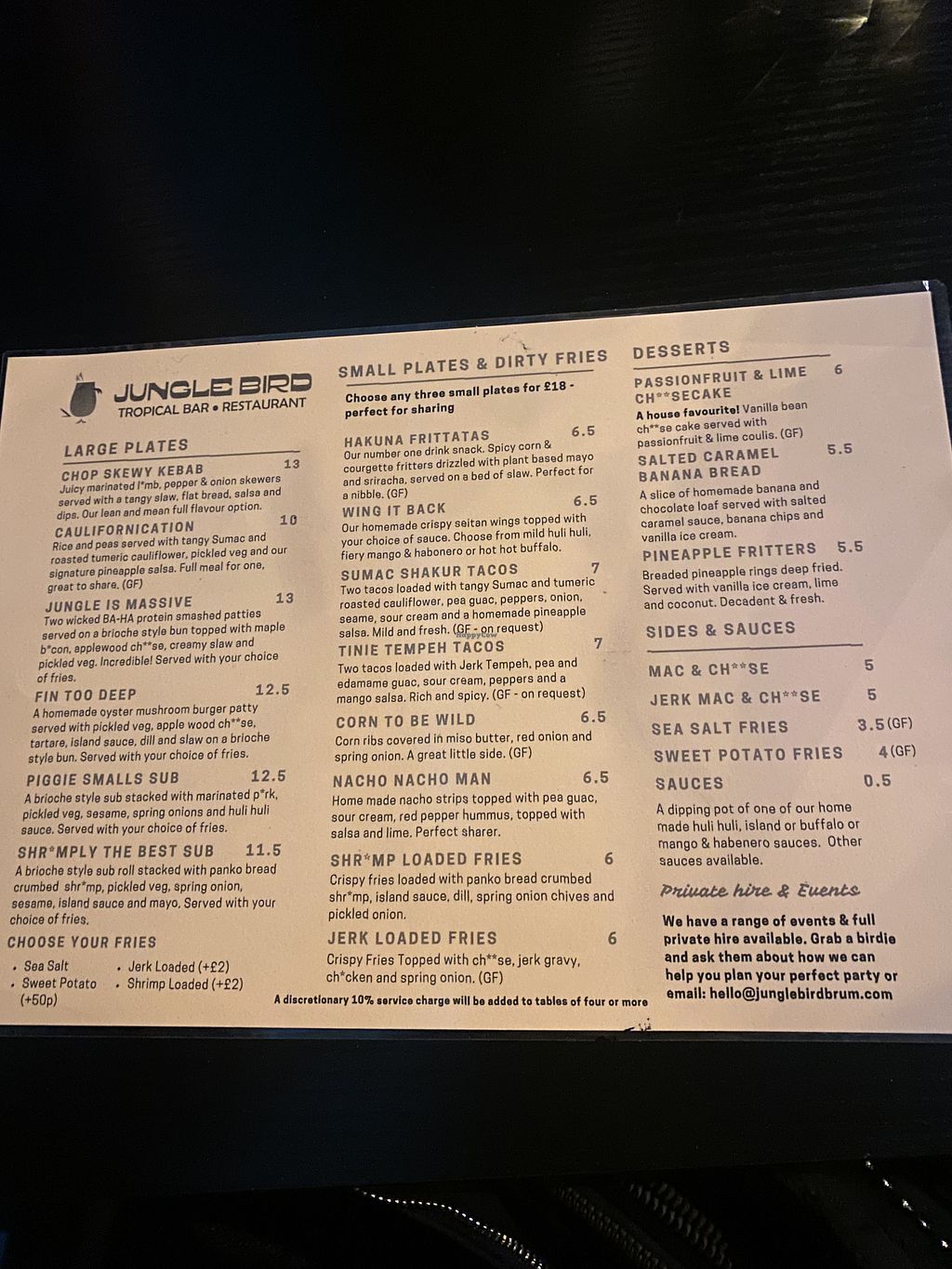 Was looking for somewhere vegan to eat on Sunday, opted for Jungle Bird based on reviews and are so glad we did. We had the Sunday roast, absolutely lovely, everything on the plate tasted amazing. Really nice cocktails too and the staff were brilliant. Will definitely be back 😊
