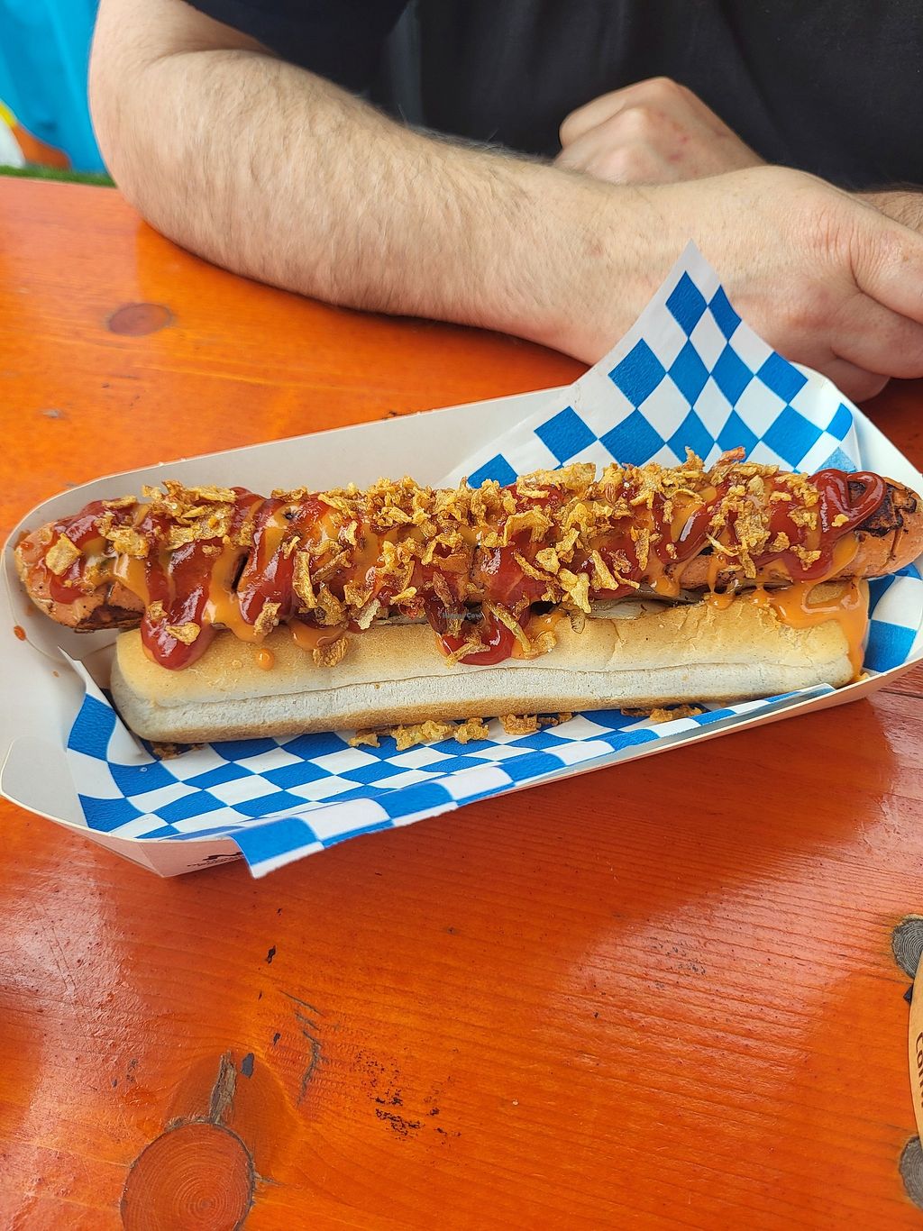 I got the jumbo not dog and it was very delicious. The sausage kind of sat on top of the hot dog bun instead of inside it so it was a struggle to eat as it was a mouthful. But very very tasty would get again