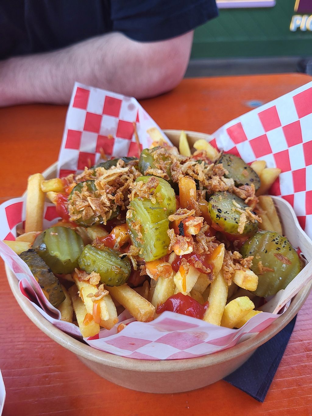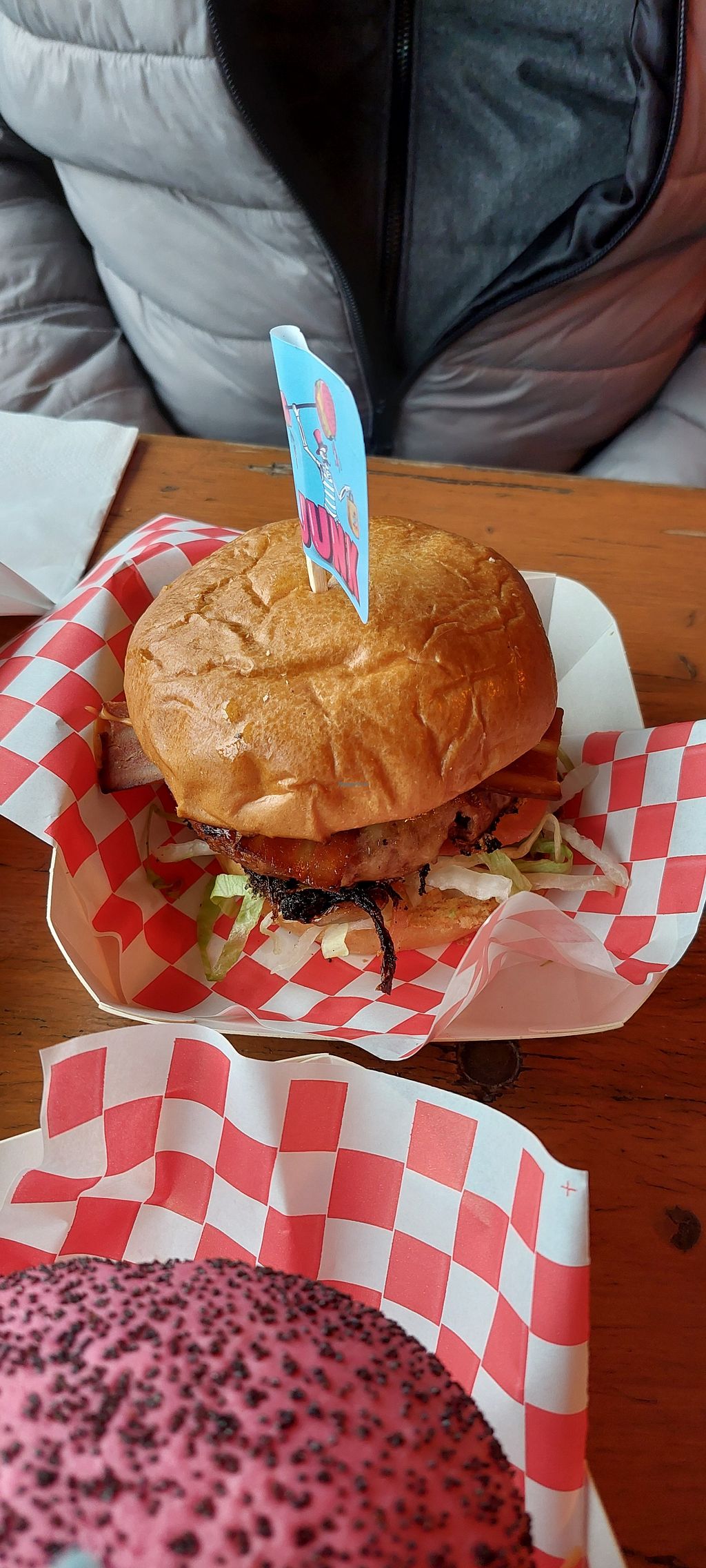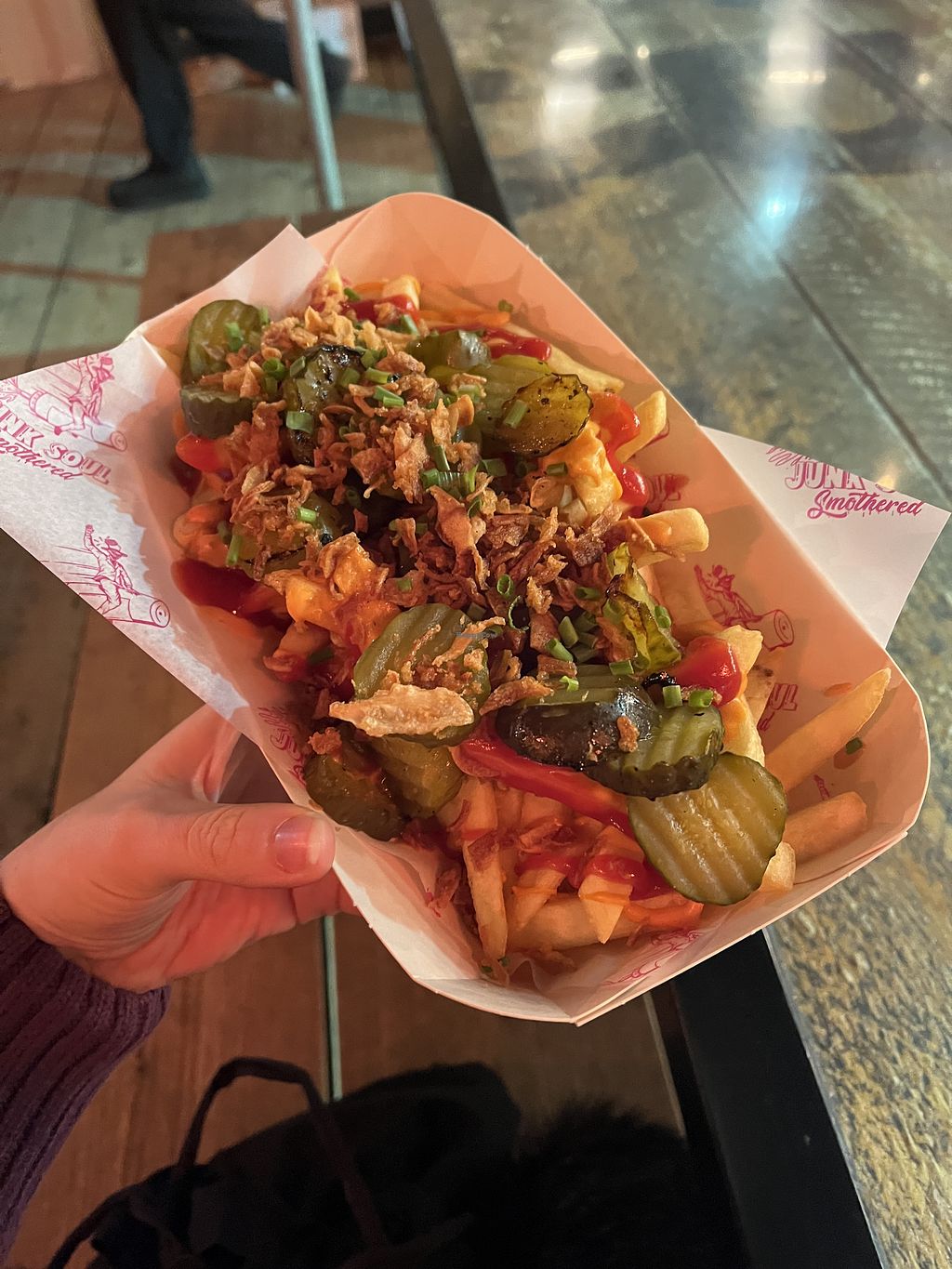 A Very tasty but messy to eat burger! Slightly disappointed as I’d wanted to try the vampire burger or the maple bacon scoffles but both were sold out! I opted for the smash burger which was a good size and I throughly enjoyed. It was £14 which I thought was slightly pricey given you don’t get a side of fries with it. My partner said the currywurst fries were great and he’s not vegan… also the currywurst portion was very generous.