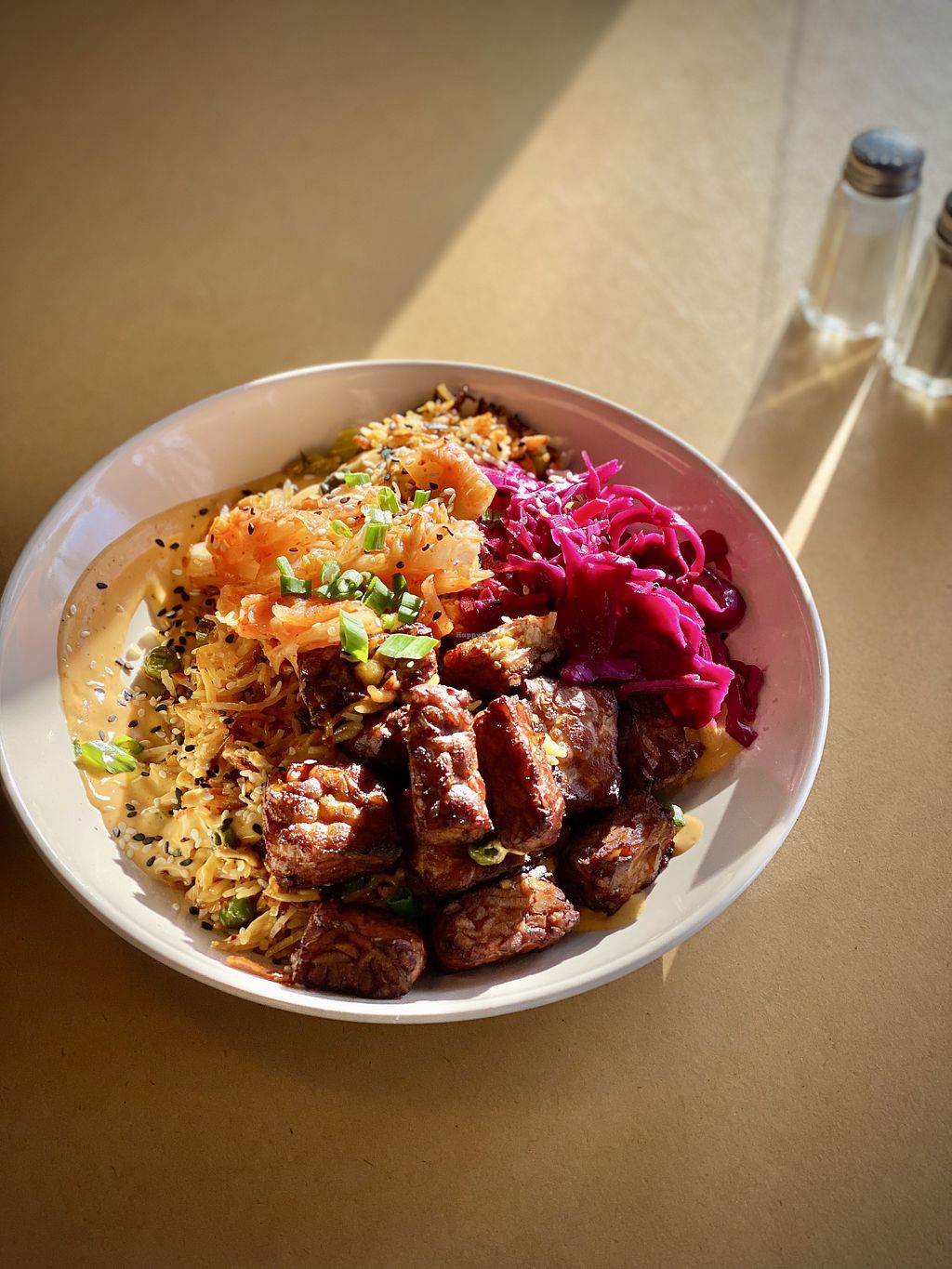 So many vegan options, with delicious marinated tempeh or jackfruit as proteins! We had the jackfruit bowl, the south bowl with tempeh, and the Kimchi fried rice with tempeh, plus the vegan almond and vegan pistachio cookies. I was in heaven. Everything was absolutely amazing and I can't stop thinking about the pistachio cookies 😍 Highly recommend!!
