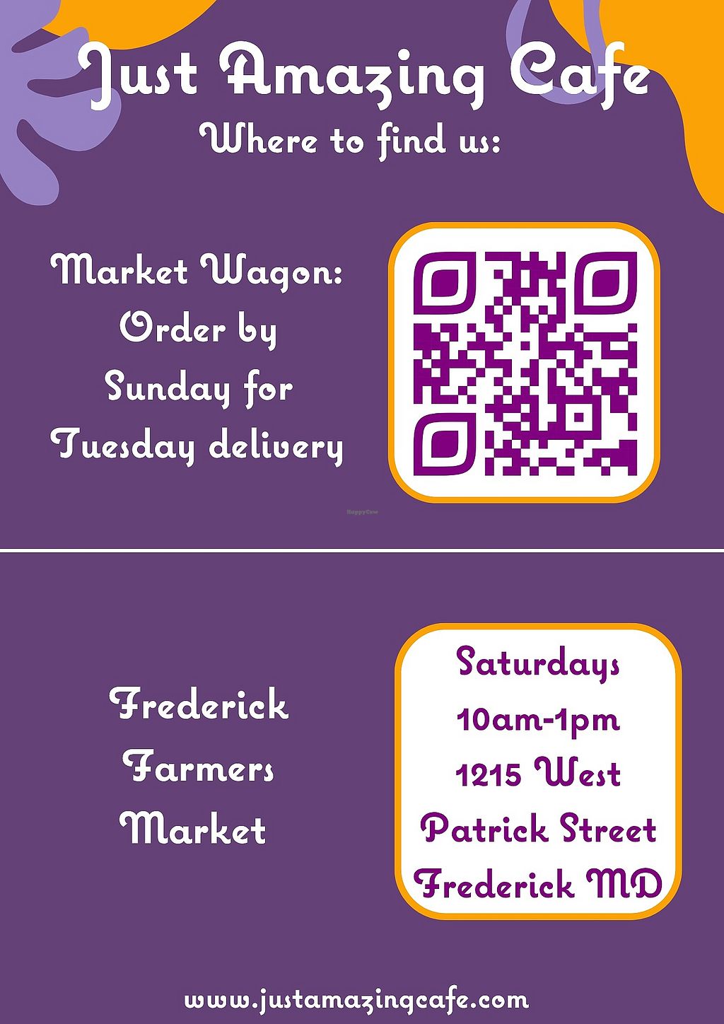 A plant-based bakery that offers vegan treats such as brownies, cookies, cinnamon buns, and muffins. Currently sells at Frederick Farmers Market on Saturdays. Also accepts orders via e-mail and DM. Follow socials for more information on hours and pop-up locations. Open Sat 10:00am-1:00pm.