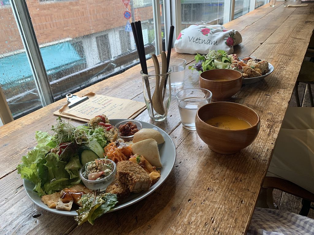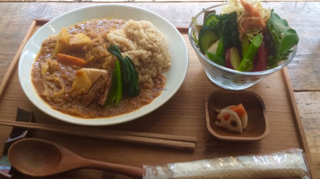 delicious vegetable & lentil curry with brown rice, pickles, and a mix…