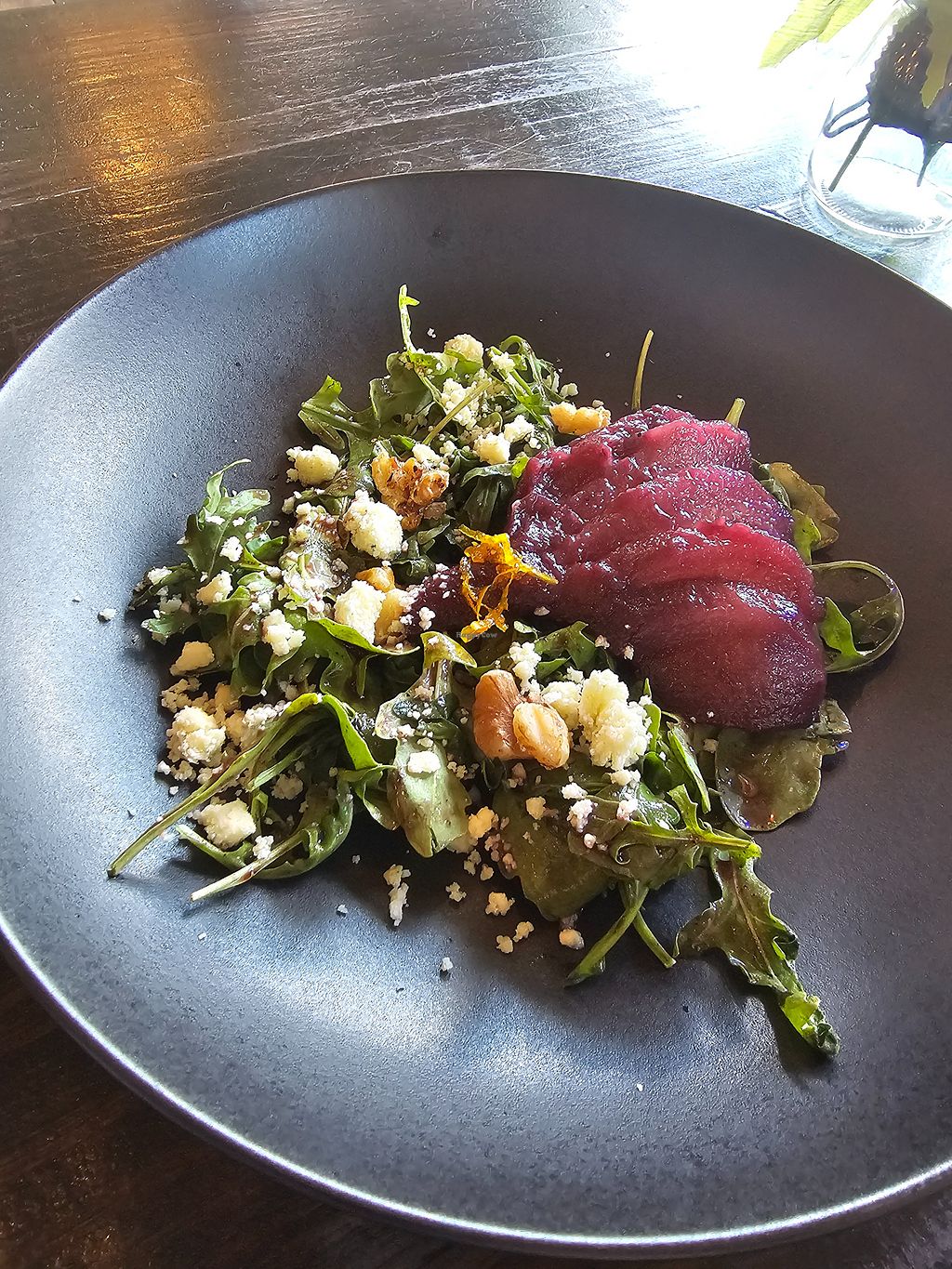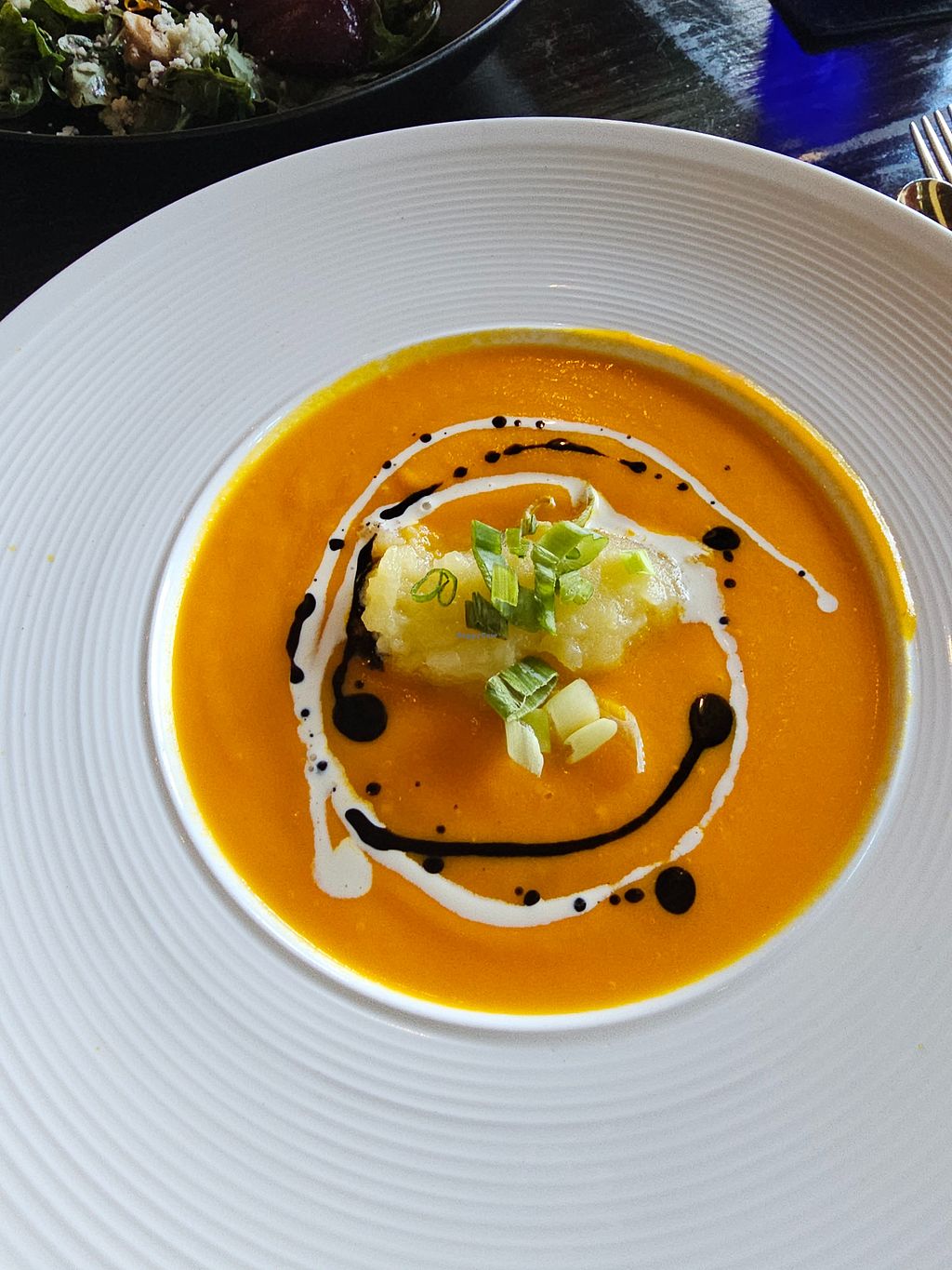 Everything was good, well presented and a treat. I shared carrot soup, shiitake escargots, Caesar salad, ‘salmon’ on bed of mashed potato. And carrot cake. All good. A bit pricey but a treat nonetheless.