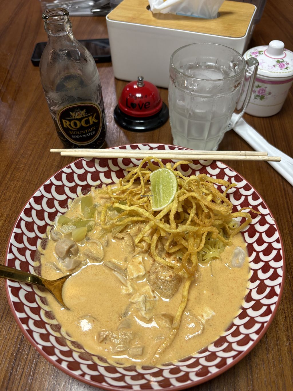 This is one of the top places we’ve eaten in Thailand. We tried their new tasting tray for two people, which lets you sample four smaller dishes of your choice for just 298 Baht—a fantastic deal. Our favorite was the Kao Soi, followed closely by the Mama Moosep Tom Yum, Bamee Moodaeng, and finally the OG. Each dish was delicious, but the Kao Soi truly stood out as exceptional. If I lived nearby, I could see myself eating here regularly. We also tried the coconut ice cream, which was incredibly fresh and served beautifully in a coconut shell. Highly recommend!"