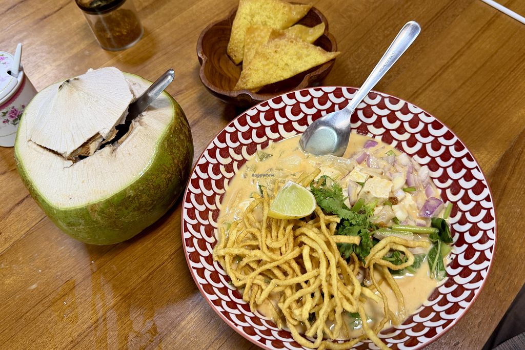 Vegan khao soi with fresh coconut