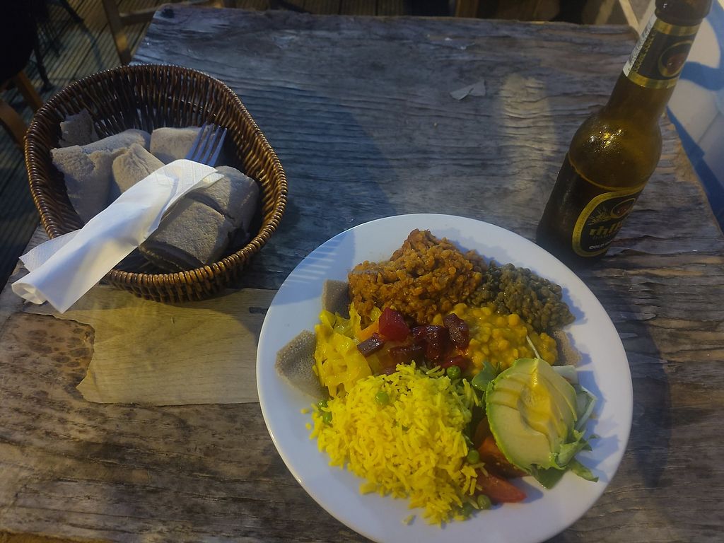 Vegan platter with injera and a beer. Very tasty!