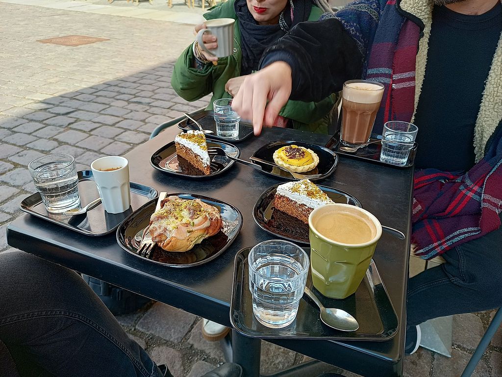 Pros: Nice seatings in the sun , The food came very quickly , Delicious Cakes