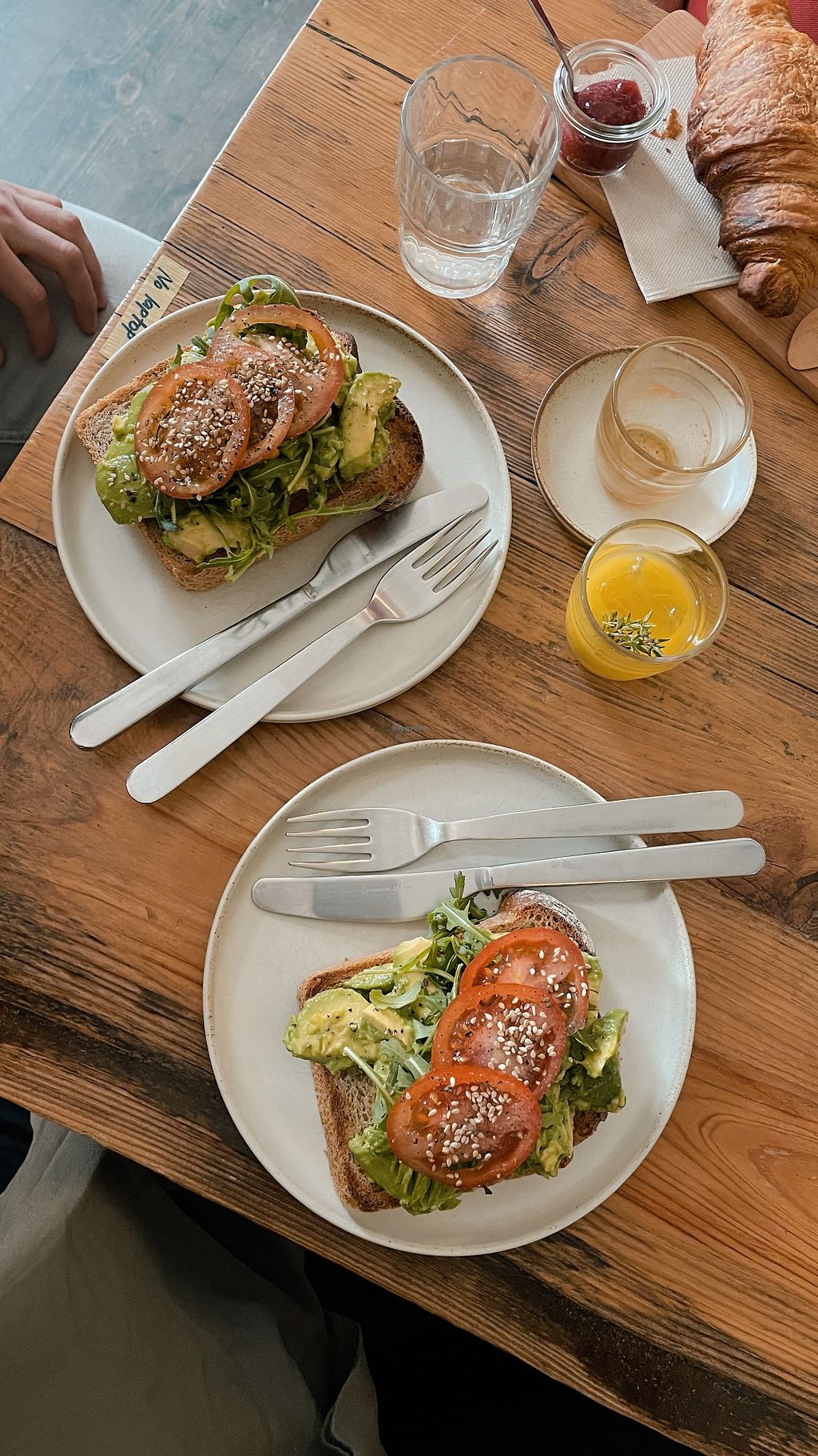 Croissants with jam, matcha latte and green smoothie