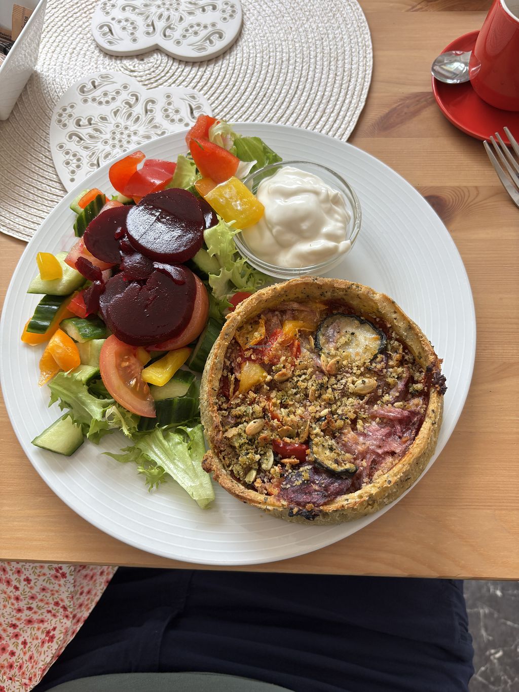 Read morePros: Vegan Mediterranean tart with salad , Espresso dopio