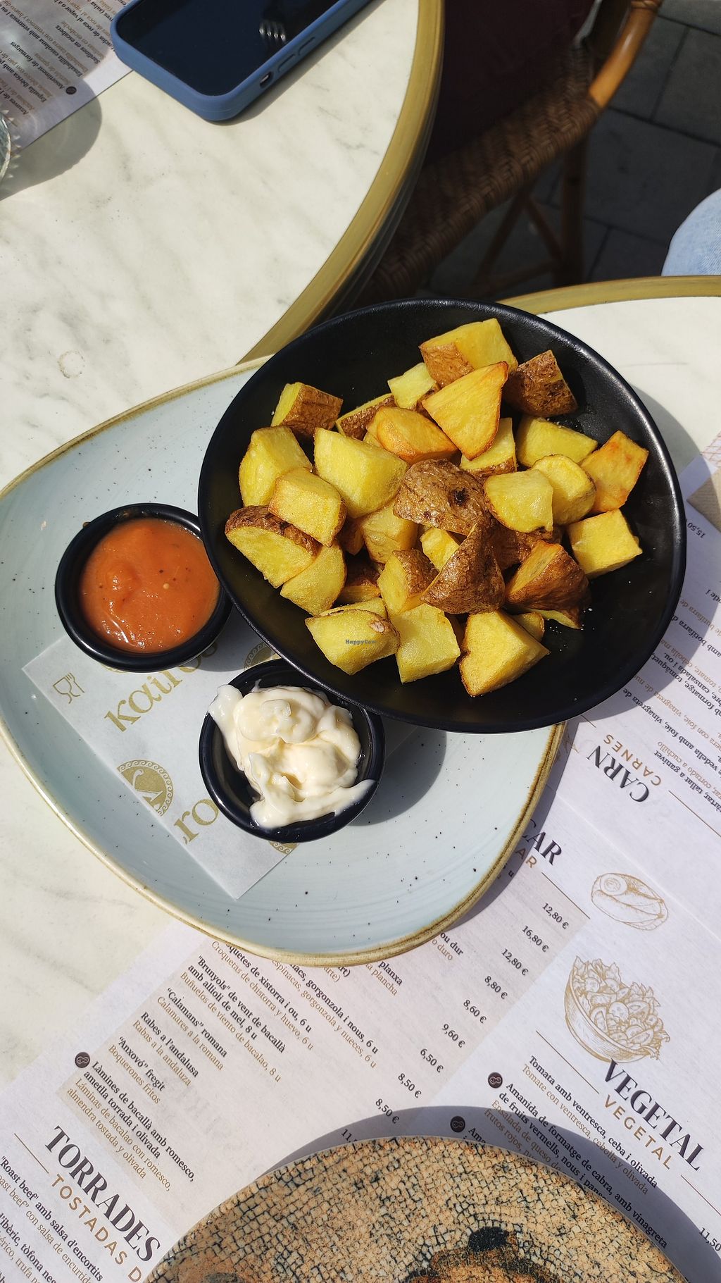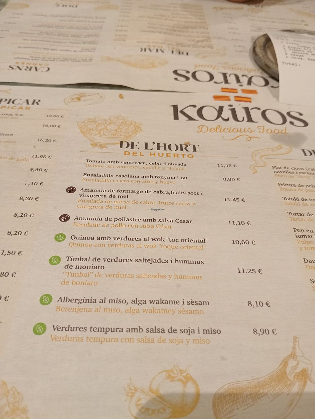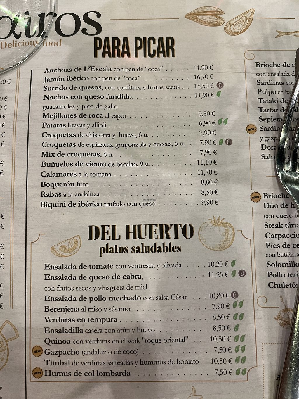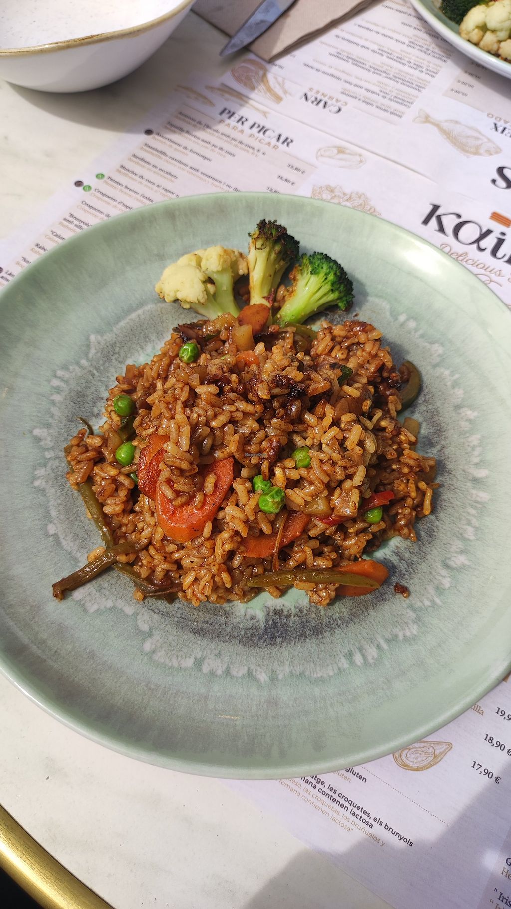 Serves meat, vegan options available. Restaurant serving Spanish food. Menu is clearly labeled and includes vegetable paella, gazpacho, patatas bravas, quinoa salad with stir-fried vegetables and more.