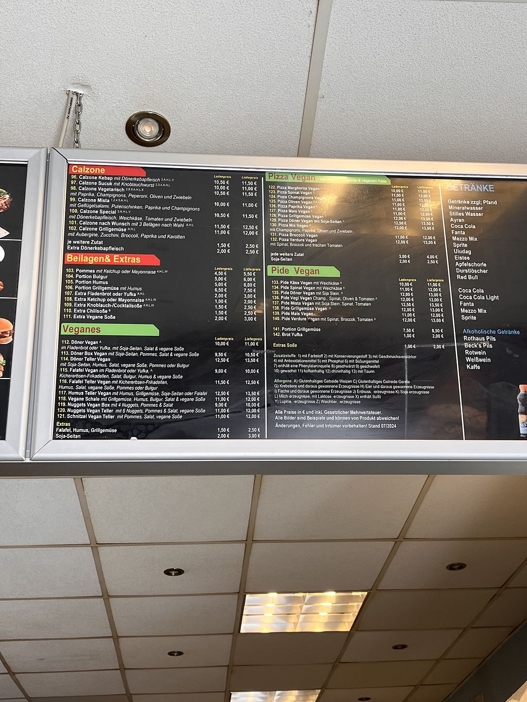 Serves meat, vegan options available. Kebab shop with clearly labeled vegan sections on the menu. Example offerings include pide, pizzas, and vegan döner. Open Mon-Fri 11:00-22:00, Sat-Sun 12:00-22:00.