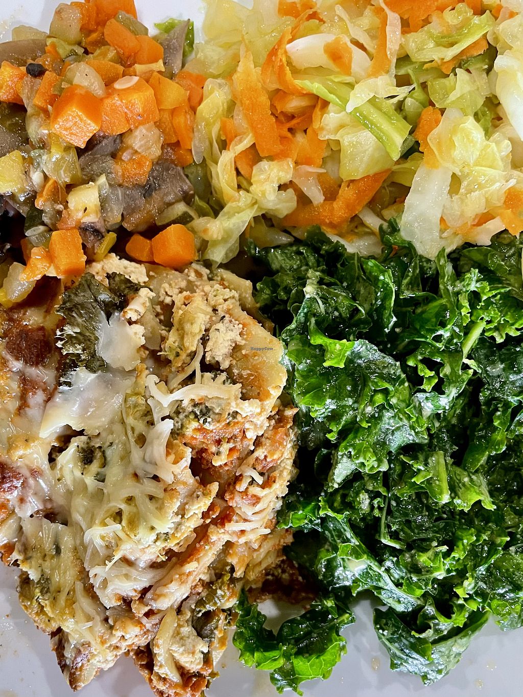 Lasagna, kale salad, Cole slaw and black eyed peas