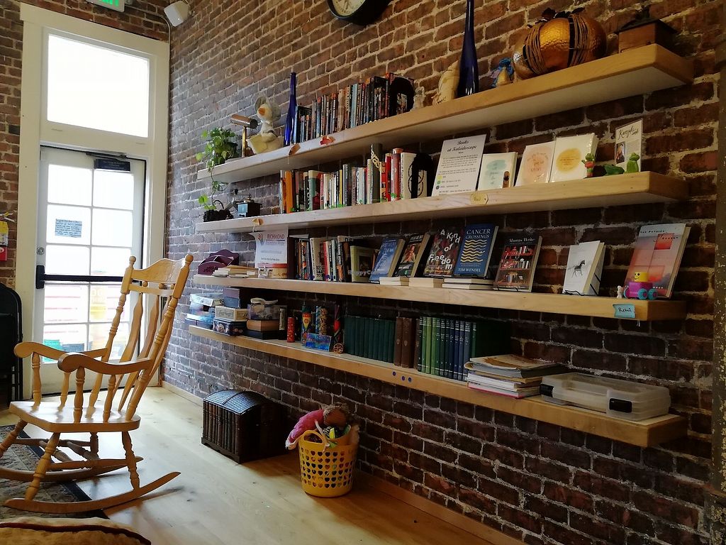 Serves meat, vegan options available. Local coffee shop that provides a variety of food options. Most food is vegetarian or vegan. Also has gluten free options, although uses shared prep area. Vegan choices include the house-made quinoa medley, blueberry salsa, red beet hummus and sorbets. Offers soy, almond, and coconut milks. Can request a vegan menu to see only vegan options. Has weekly open mics, monthly storytelling, music and other community events. Open Mon-Sun 7:00am-7:00pm.
