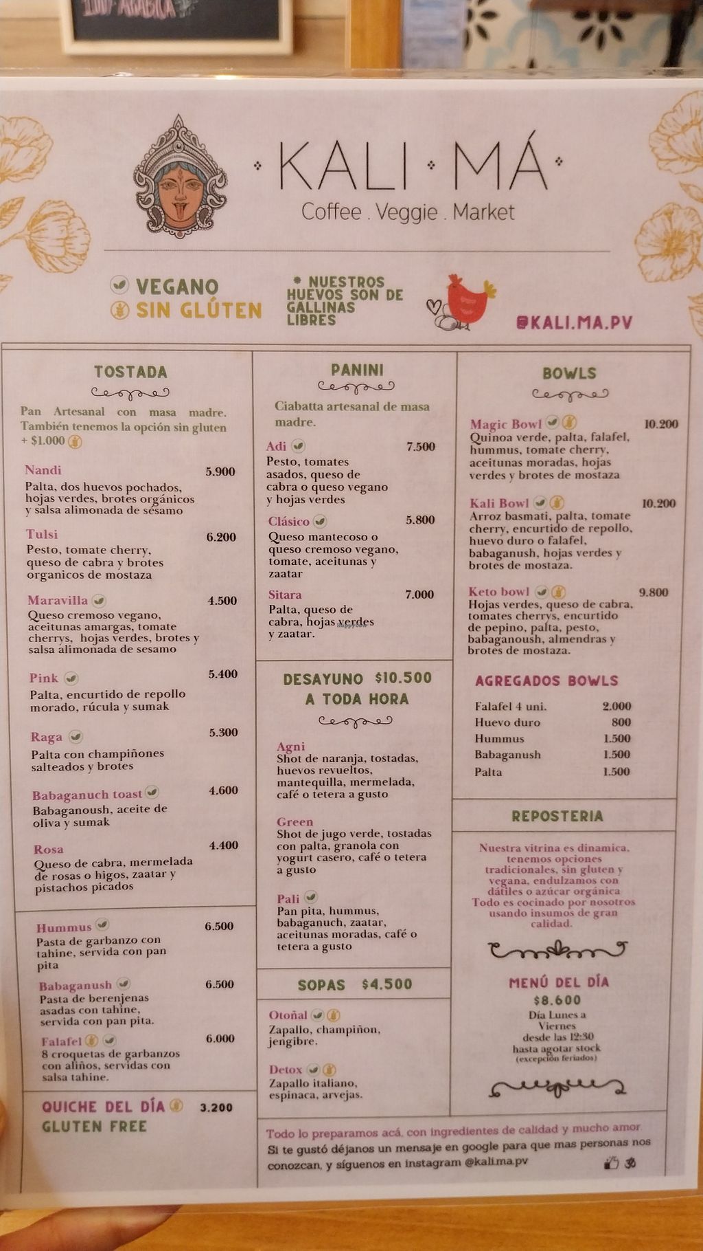 So much to choose from on the menu. We tried the Kali bowl and the Maravilla tostada. The falafel, hummus and babaganush were amazing. The vegan cheese was a little odd but the flavours of the dishes overall were excellent. Also loved their vegan banana bread. All meals are made fresh. Highly recommend!