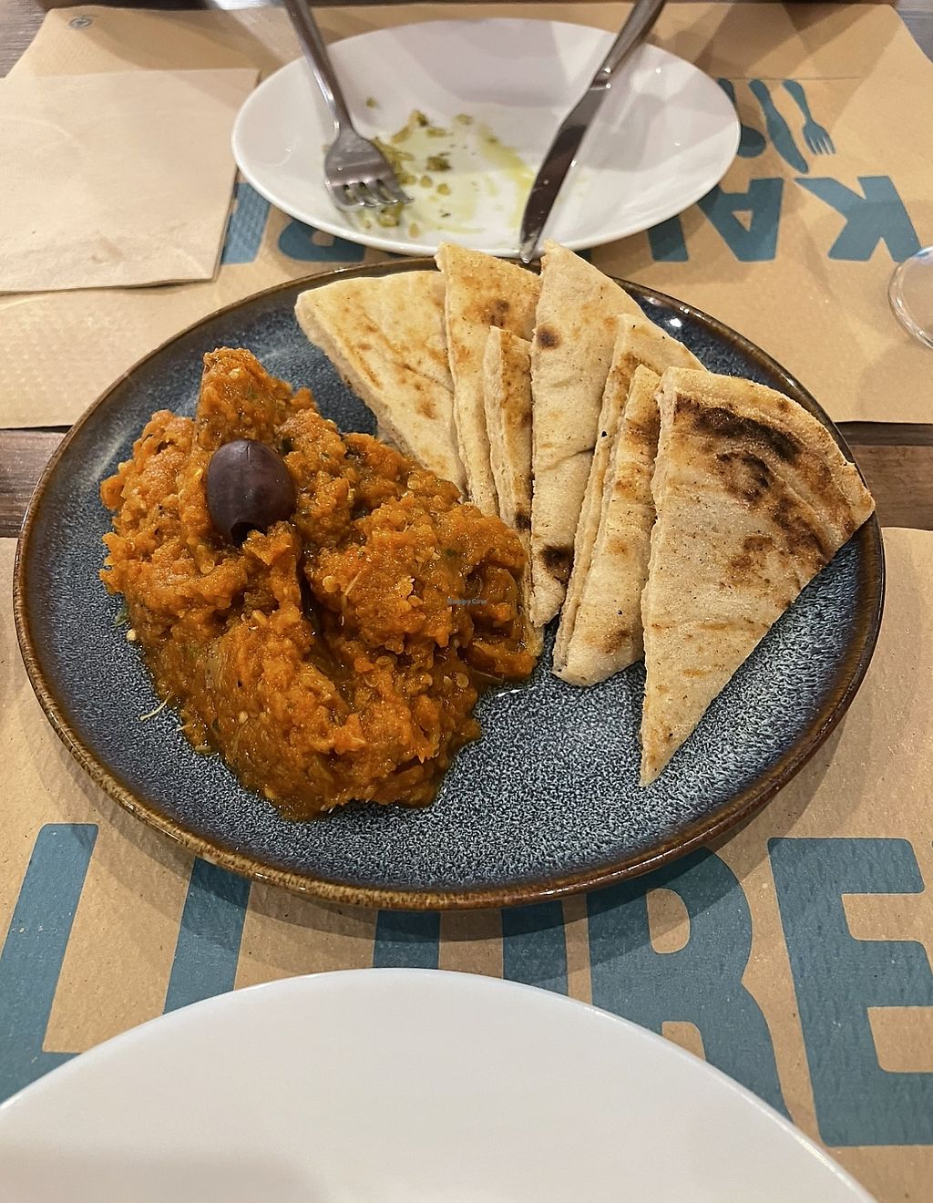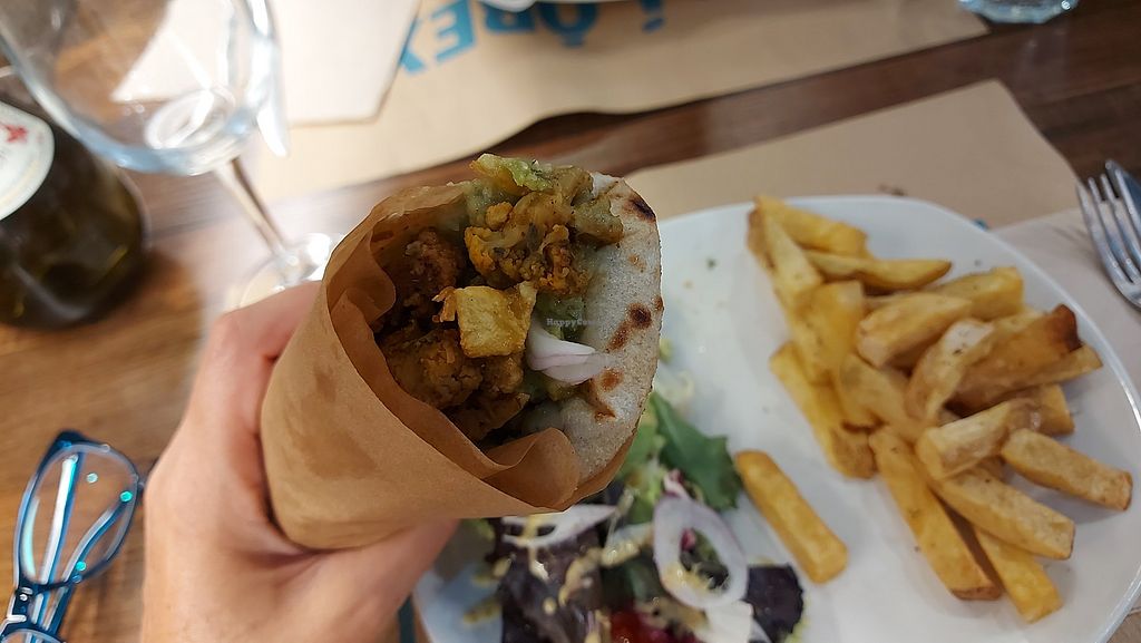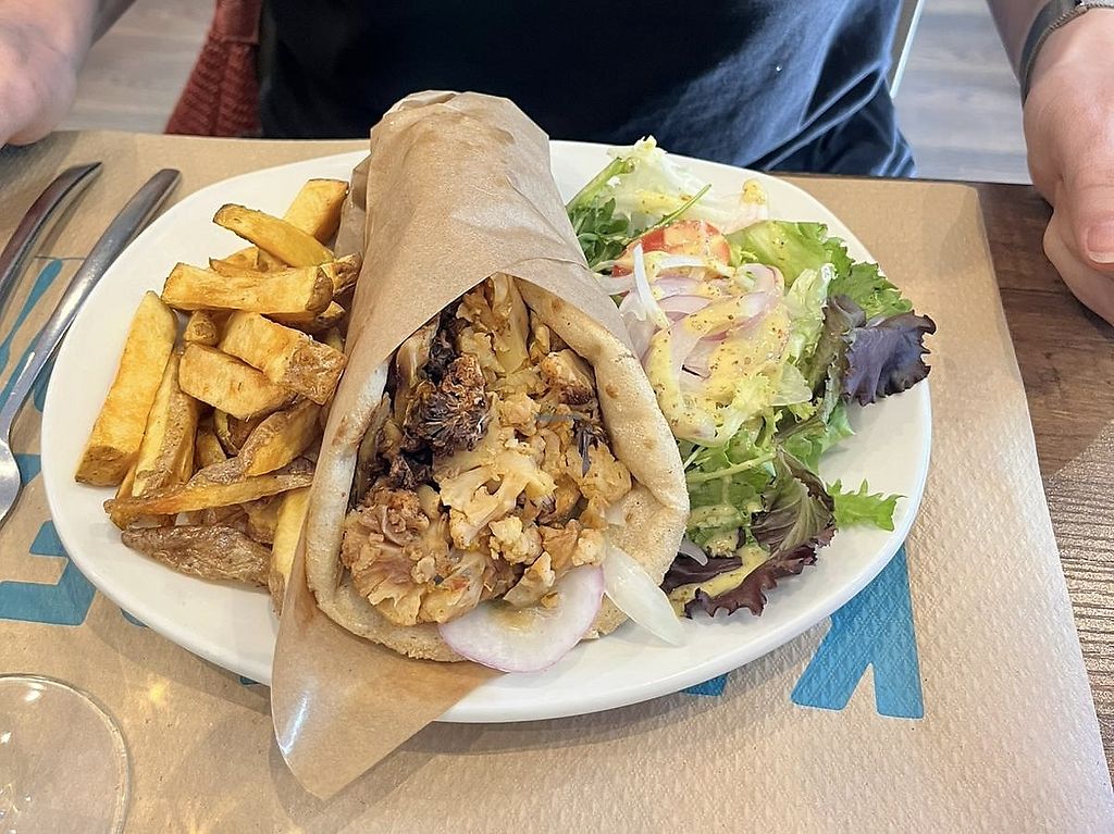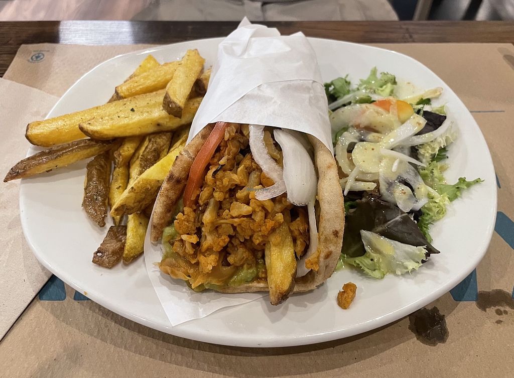 ein veganes Experiment. griechische Pita gefüllt mit rauchigem Blumenkohl. sehr fettig. als Vorspeise Salat mit selbst gemachtem Käse (nun ja). hat alles gut geschmeckt, war aber teuer im Vergleich. netter Service.