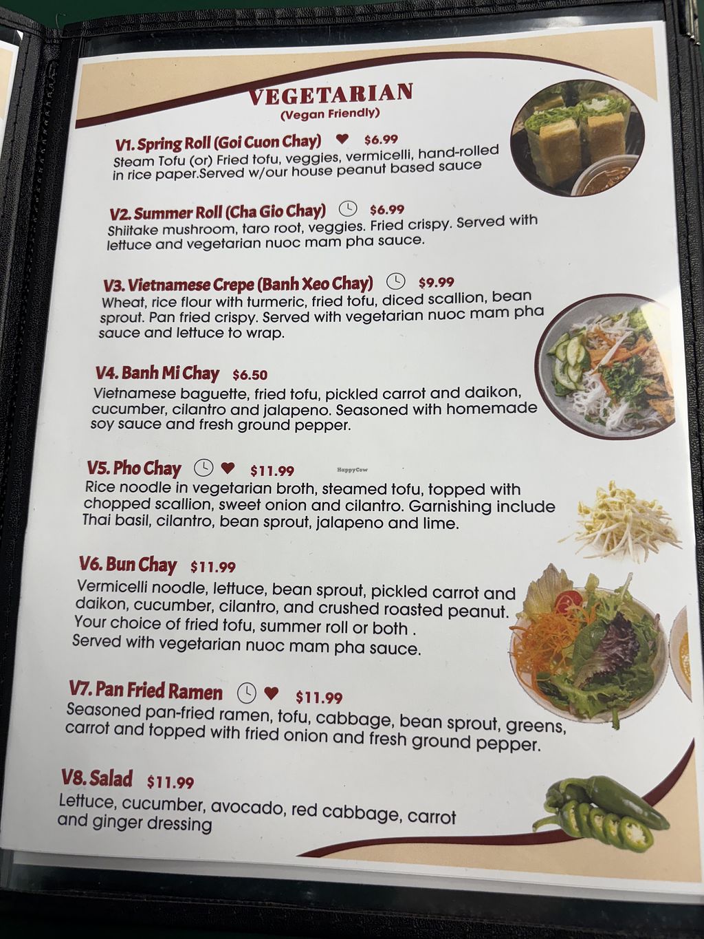 The vegan/vegetarian options were clearly on the menu. The food was fresh and delicious. I had the Bahn Mi Chay and summer roll ( cha Gio Chay)