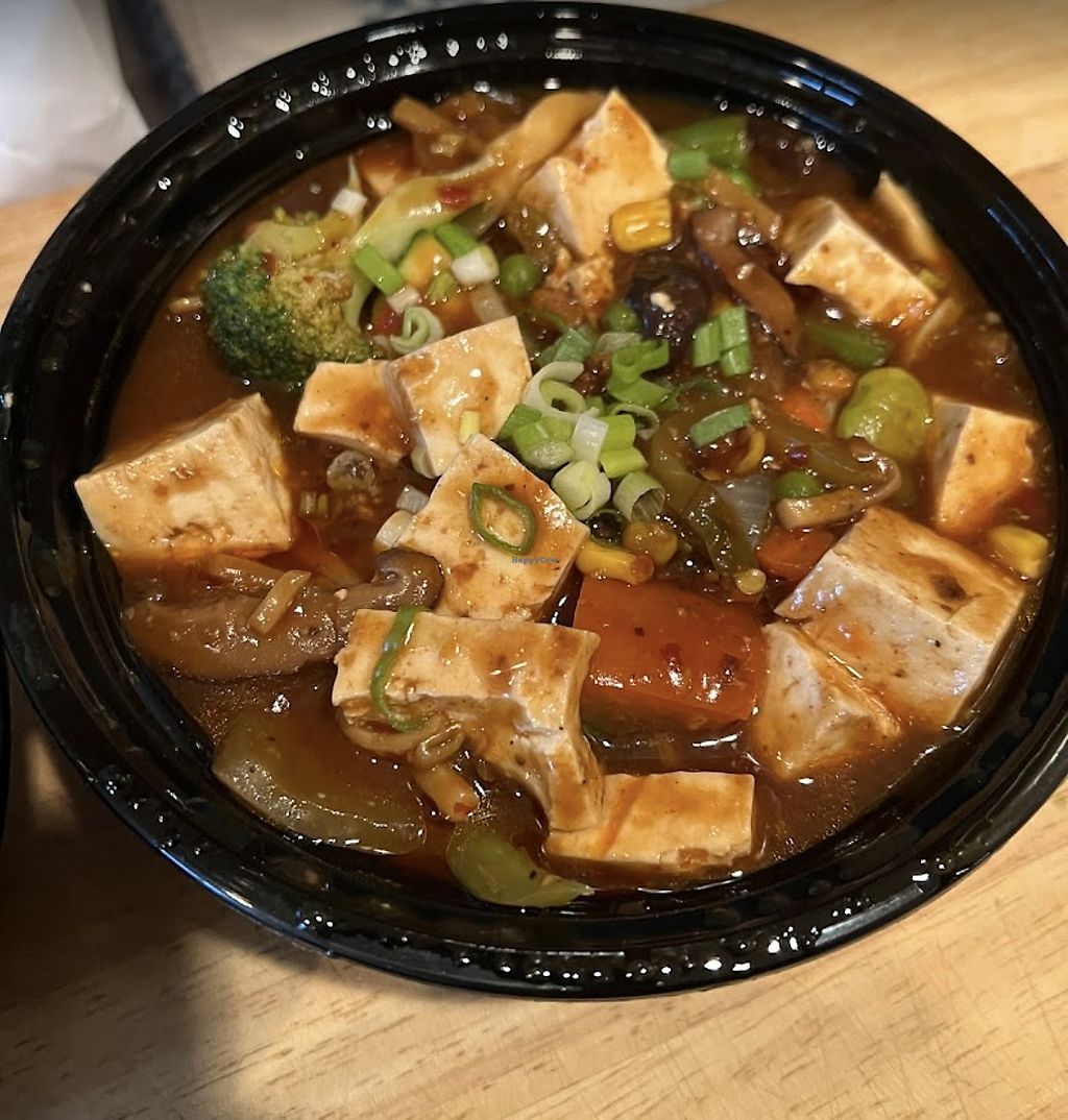 Serves meat, vegan options available. Serves meat, vegan options available. Chinese takeaway restaurant with vegetable section on menu. , tofu mixed vegetables, garlic mixed vegetables, curry mixed vegetables, mu shu vegetables, ma po tofu, vegetable fried rice (remove egg), egg rolls. Open Mon-Sun 2:00pm-10:00pm. open 2pm-10pm daily.