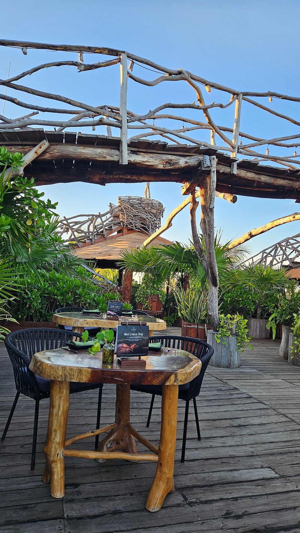 Serves meat, vegan options available. Treehouse restaurant in Kanan Tulum hotel overlooking the ocean. Offers a full course vegan menu with seven different dishes. Open Mon-Sun 5:30pm-10:30pm.