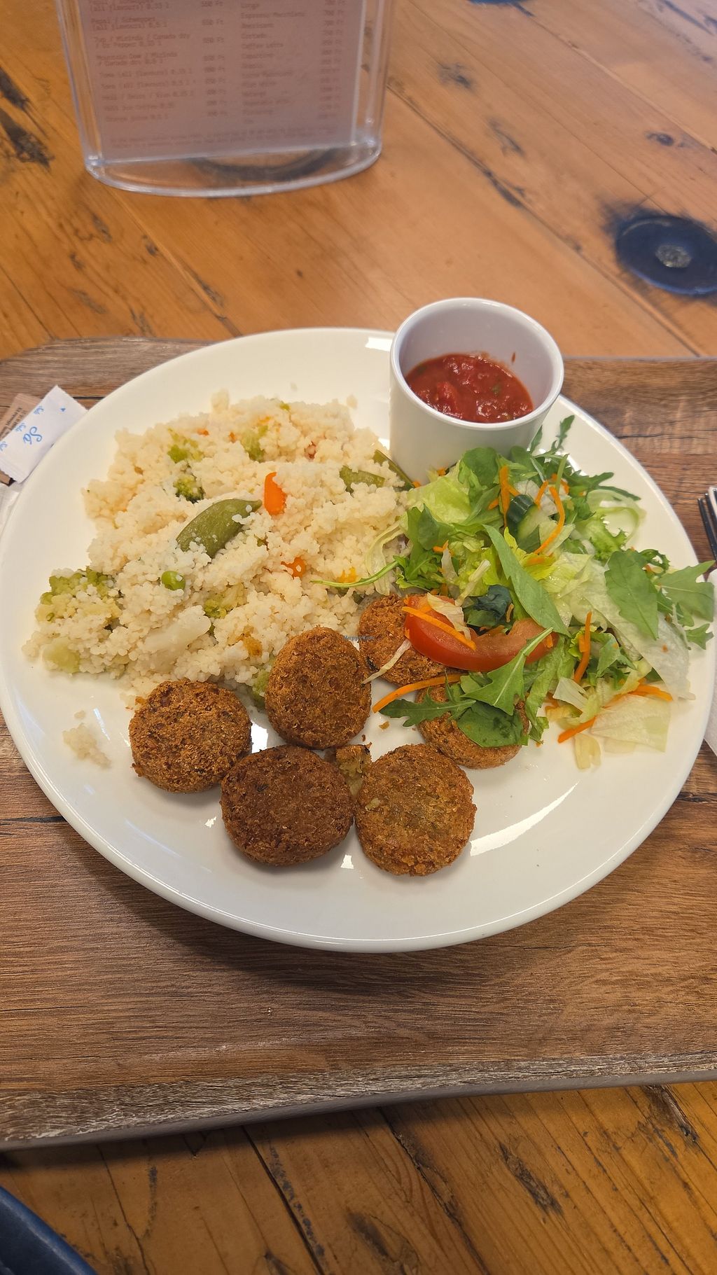 Vegetable couscous and vegan "meatballs " with tomato salsa