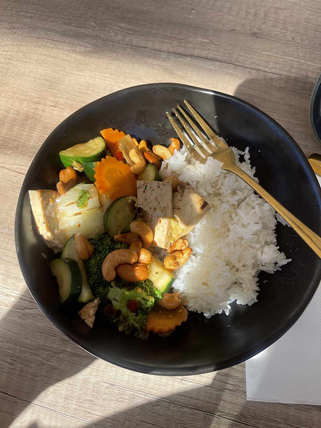 Frindly staff. Opens 9am. Lots of choices. Dog friendly. Food was great. I ordered cashew tofu stir fry with rice. In a town with practically no gf and Vegan options this is by far the best place to.eat.