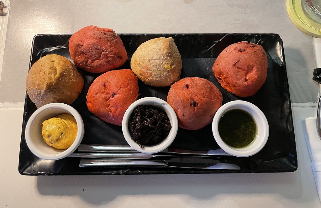 Bread basket - the onion dip in the middle is vegan. The other dips ar…