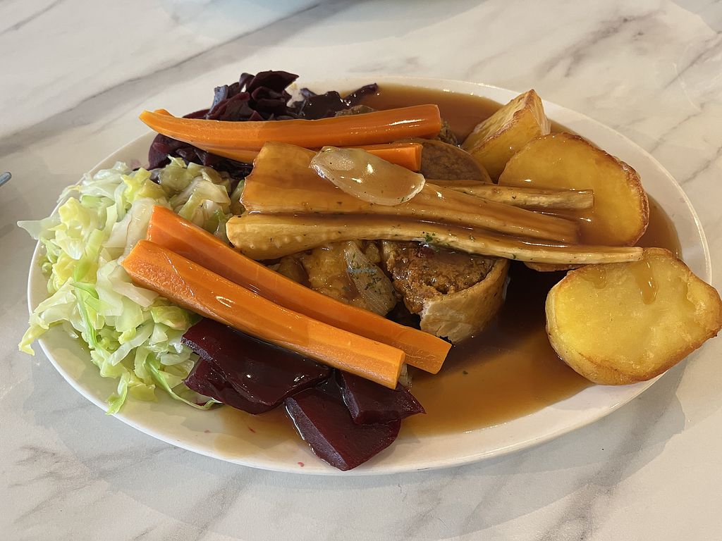 I went for the Wellington option. It was superb. The Sunday roast is as good as I remember (I last visited about eight years ago). My son had chick’n burger which he enjoyed. The staff are lovely & the vibe is obviously good. It’s impossible to fault this place.