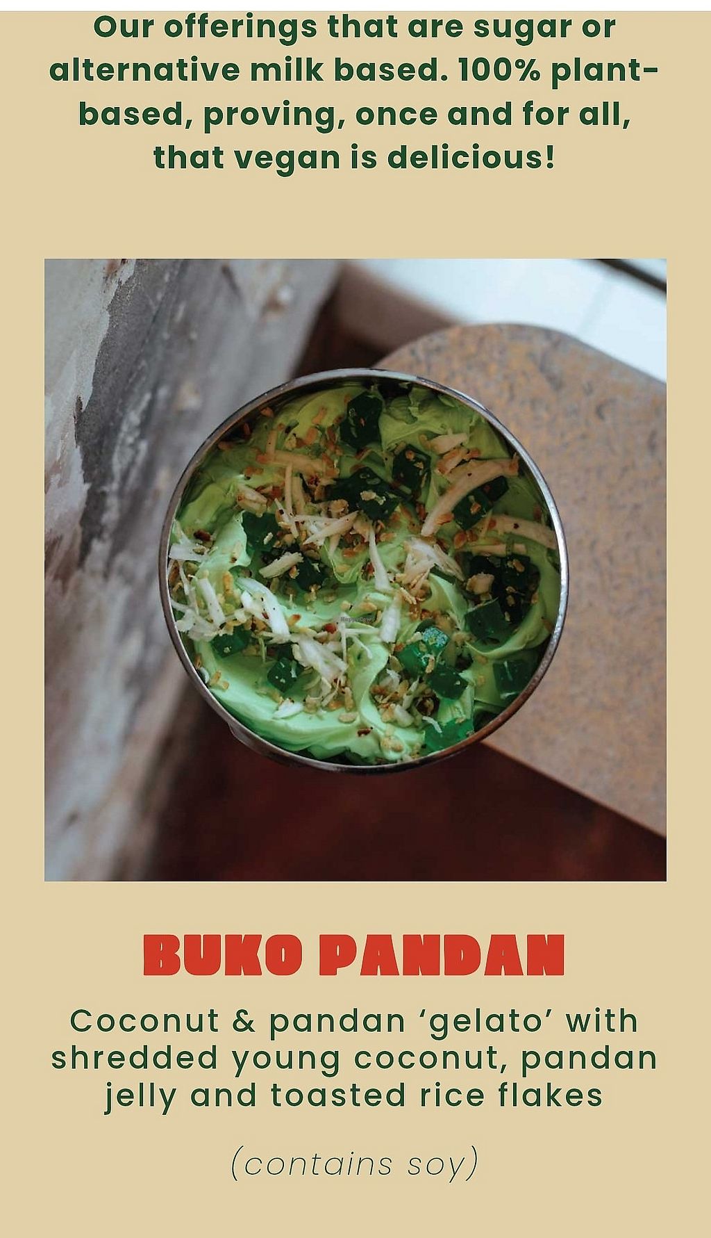 Small-batch gelato shop inspired by Filipino flavours . Offers vegan sorbet options including proot shakes (coconut sorbet with jasmine, tropical fruit), buko pandan and kalamancypoles. Cones are vegan. Gelato is not all vegetarian: some varieties contain egg, gelatin and/or and fish sauce. Open Mon-Thu 12:00pm-9:00pm, Fri-Sat 12:00pm-10:00pm, Sun 12:00pm-9:00pm.