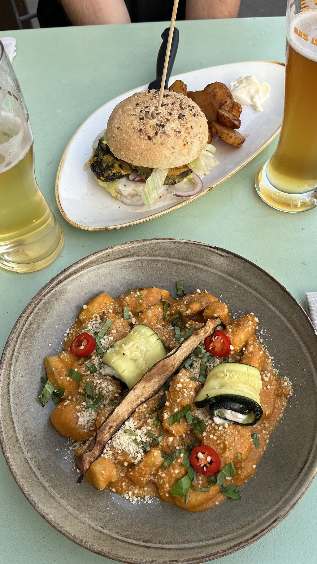 Tempeh Burger with sliced baked potato 28.00.- (smoked tempeh burger w…
