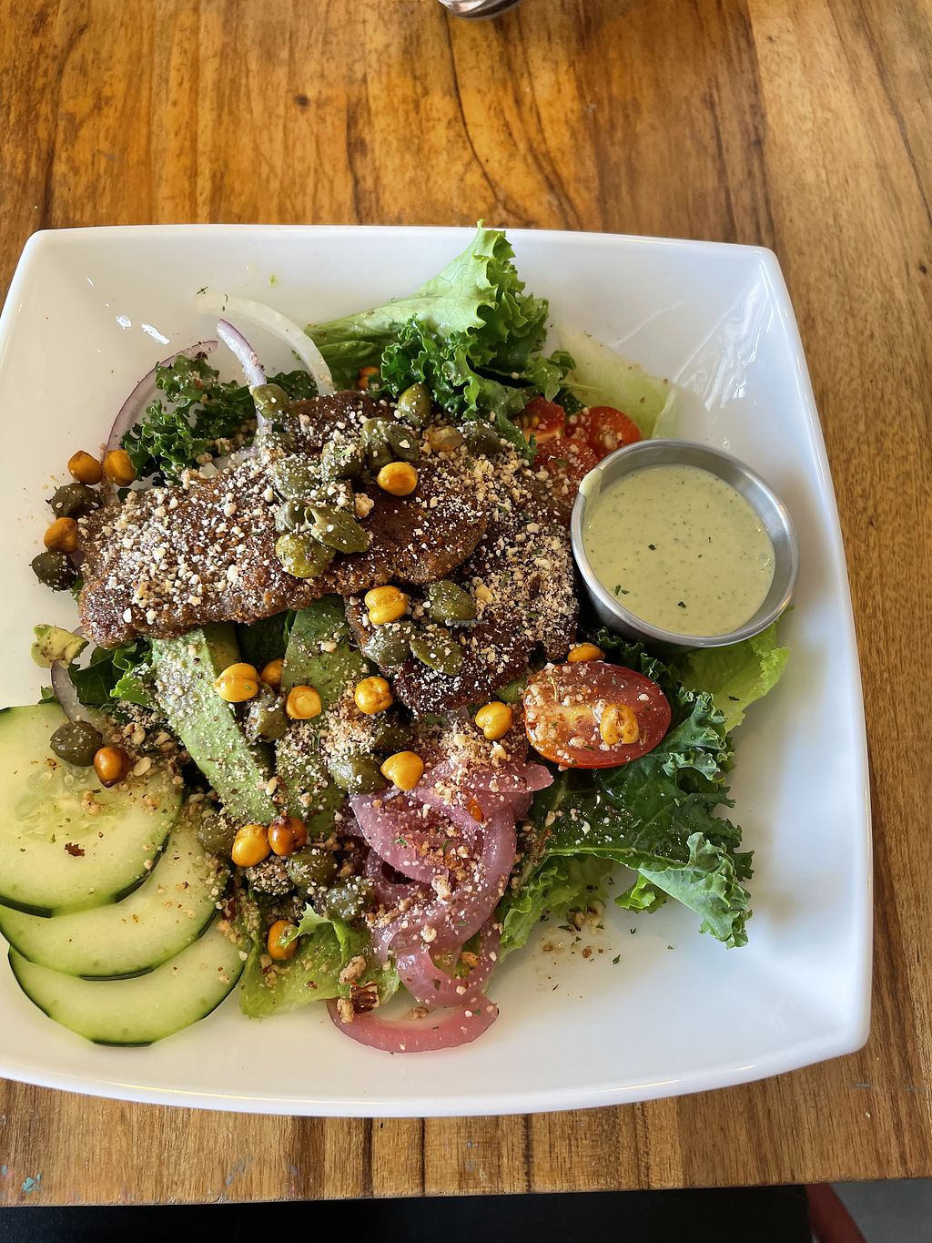 Delicious vegan food, kind staff, and nice vibe. I ordered the seitan salad, and the seitan was unexpectedly greasy, but the rest of the salad was healthy. My partner had the tofu sandwich, and he enjoyed it. The corn ribs were fantastic. We got a chocolate chip cookie to go, and it was great.