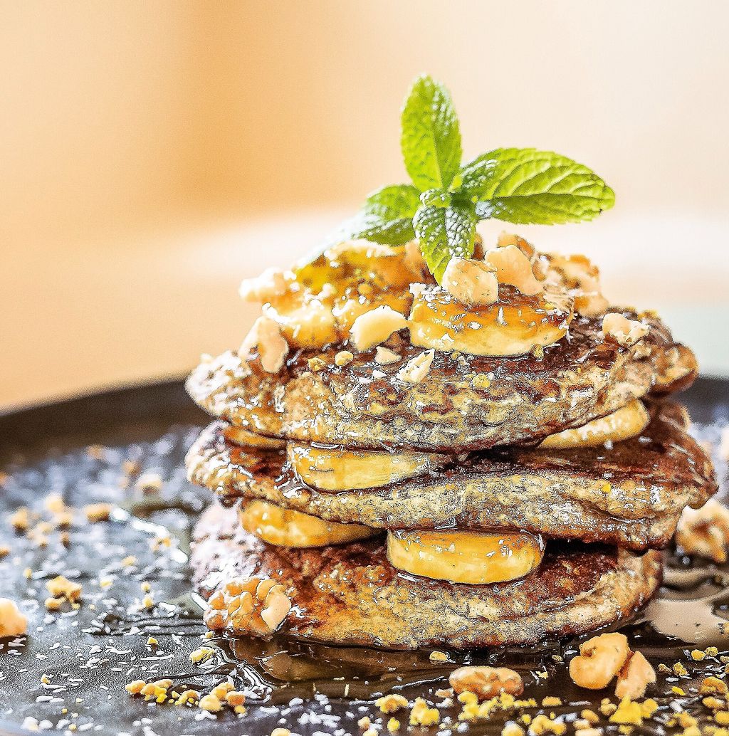 Banana oat pancake, walnuts and Greek honey.Freshly homemade breakfast…